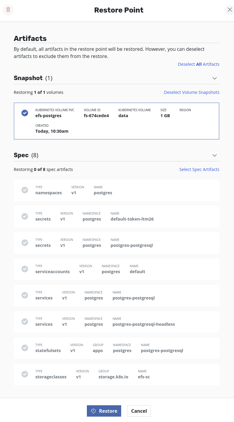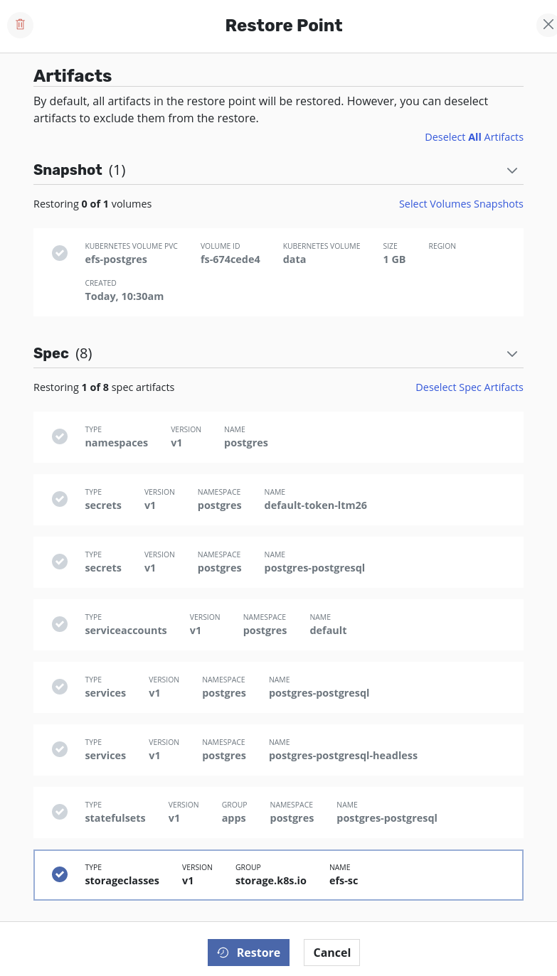 Applications→your_namespace→RestoreSelect a restore point. From details, deselectSpec Artifactsand deselectVolume Snapshots. Only the StorageClass has to be restored first and therefore only that should be selected from the list of specs. ClickRestore.Once the restore job is successful, volumes can be restored. To accomplish that, select the same restore point as before but this time,