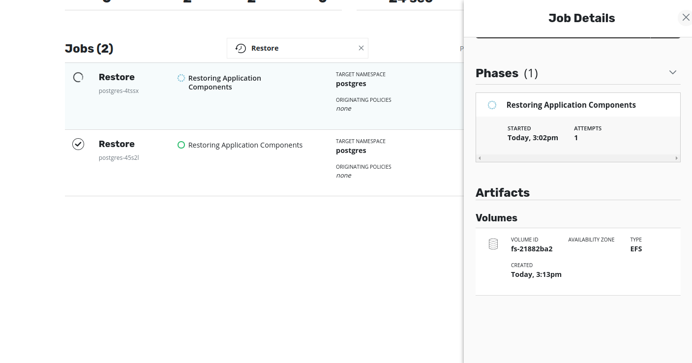 Volumeartifacts are set during the process. The job artifacts can be seen by clicking on the restore job. Once the Volumes artifacts are set, the Volume ID (i.e thefile-system-id) will be visible in the description.The EFS volume will have been created in the target cluster but is linked to the VPC of the source cluster. As a result, this restored EFS volume will not be accessible to any application running in the target cluster. In other words, an attempt to restore the application will result in failure to bind the pods to the restored PVC. Hence, to restore the application successfully in the target cluster, the restored EFS volume should be made available from the target VPC. This can be achieved by updating the VPC and mount targets of the restored EFS volume using AWS CLI (or AWS Console).