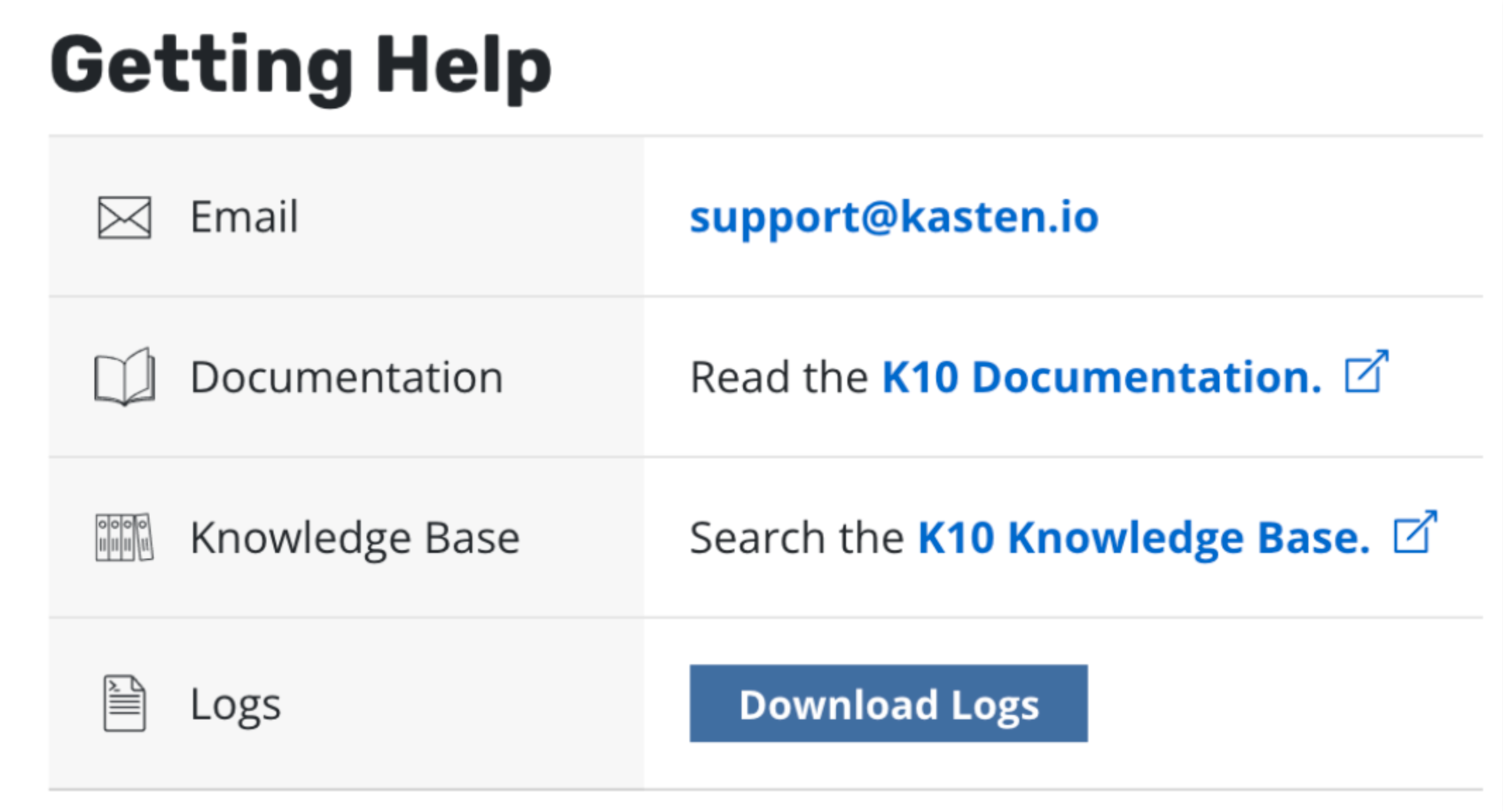 If you have questions or need support, please refer to Kasten K10 Community Support or open a case via https://my.veeam.com.