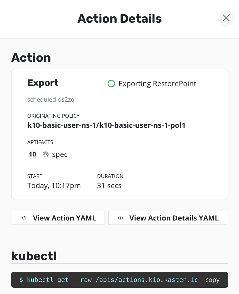 namespace named k10-basic-user-ns-1 created this ExportAction.