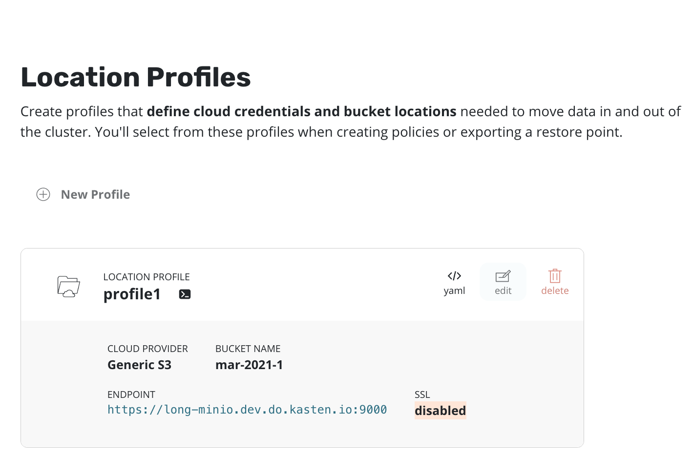 The users of application-scoped policies require read-only access to location profiles. They depend on the administrator for creation of profiles. The image below shows the profiles page as seen by such a user. The user can list/view the profiles that they have been given access to. But they cannot create, edit or delete them. Refer to this page for setting up RBAC to provide access to profiles in K10's namespace for non-admin users.
