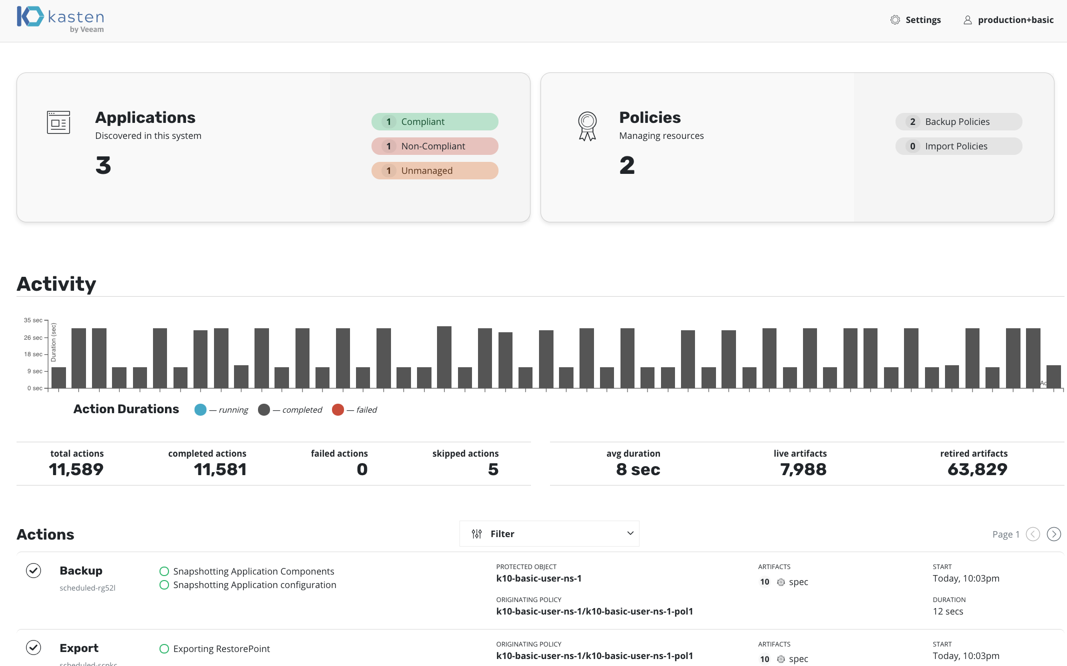 Users who are not administrators can create K10 policies in an application's namespace for protecting only that specific application. The image below shows the dashboard as viewed by a non-admin user who has access to policies.