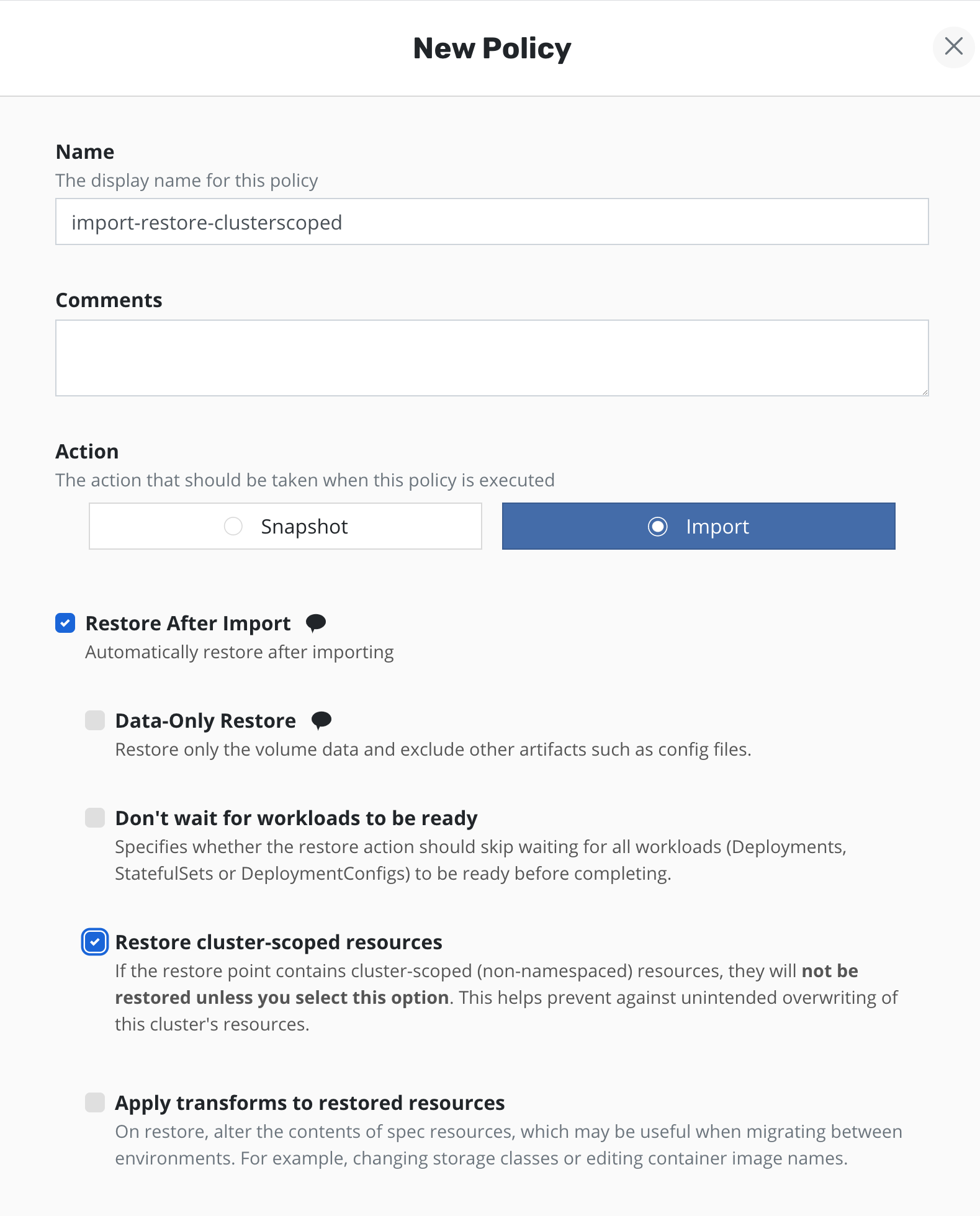 Import polices that import from a location containing a cluster restore point will import the cluster restore point as well as any restore points in the location. Cluster-scoped resources can be restored manually from an imported cluster restore point.