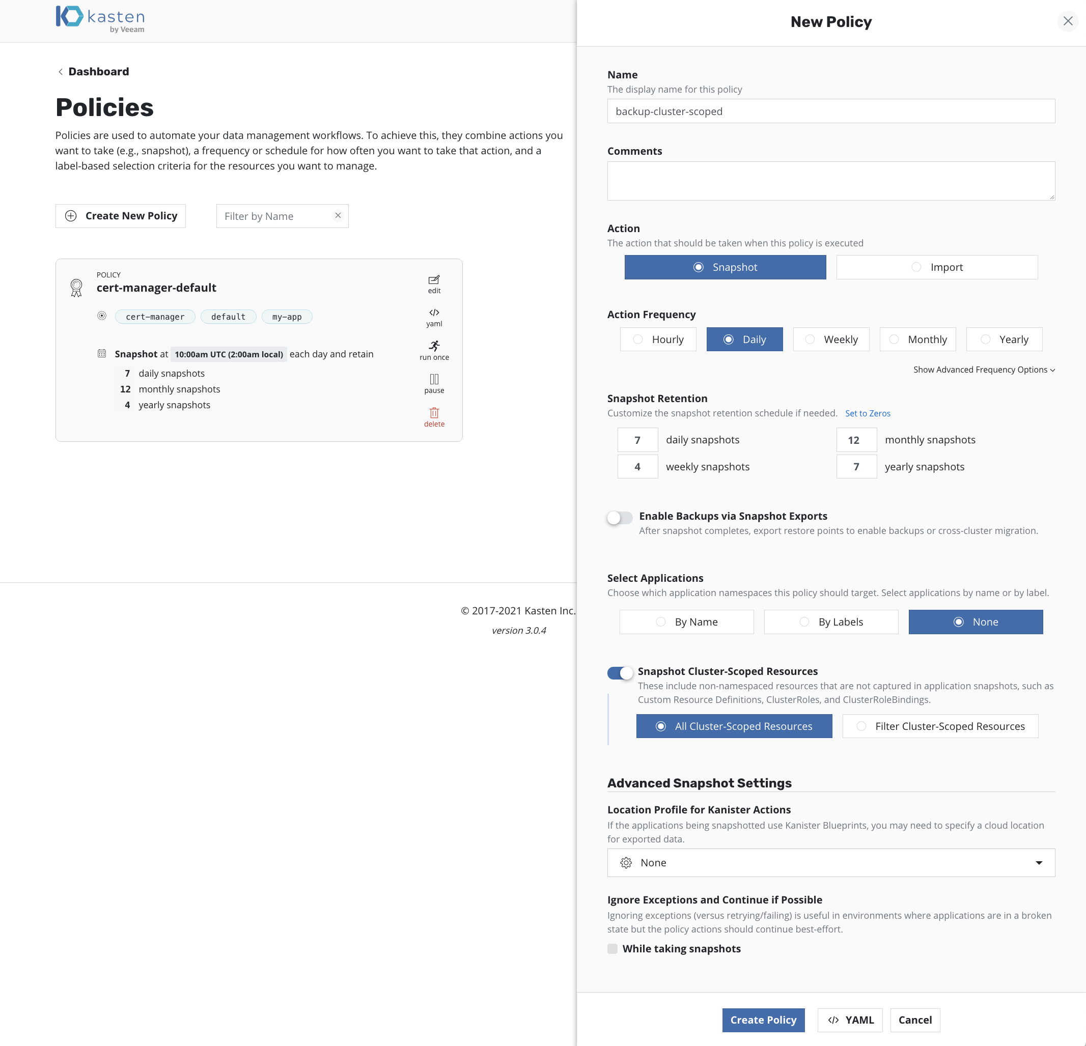 Snapshot Policies for Application and Cluster-Scoped Resources