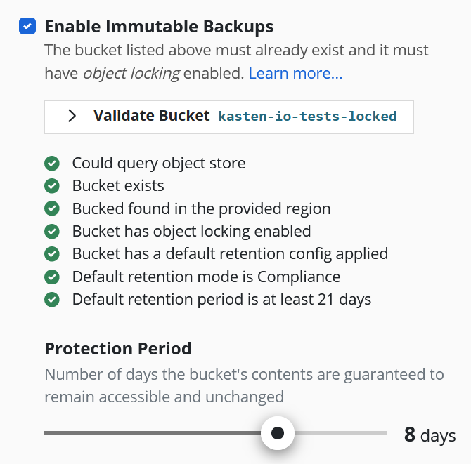 This requirement puts an upper bound on the longest protection period that K10 can guarantee. For example if an S3 bucket has a default retention of 60 days, the maximum requested protection period that K10 will accept for that bucket will be 40 days.