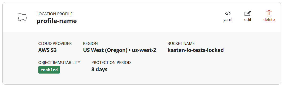 Profiles that reference object-locked object store locations and have immutable backups enabled will display this on its respective profile card: a field indicating "Object Immutability" is "enabled", and the chosen protection period.