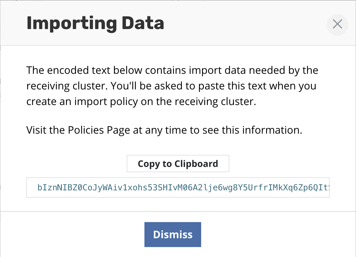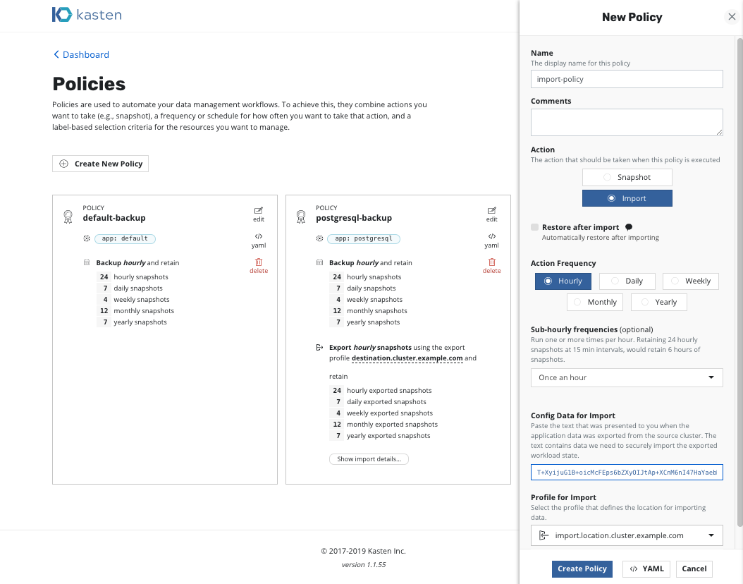You will also need to paste the text block displayed by the destination cluster's export policy (or shown during a manual export) to allow K10 to create the data export/import relationship for this application across the clusters. Finally, similar to the export workflow, a location profile also needs to be selected. The destination cluster usually only needs read and list permissions on all the data in the shared storage system.
