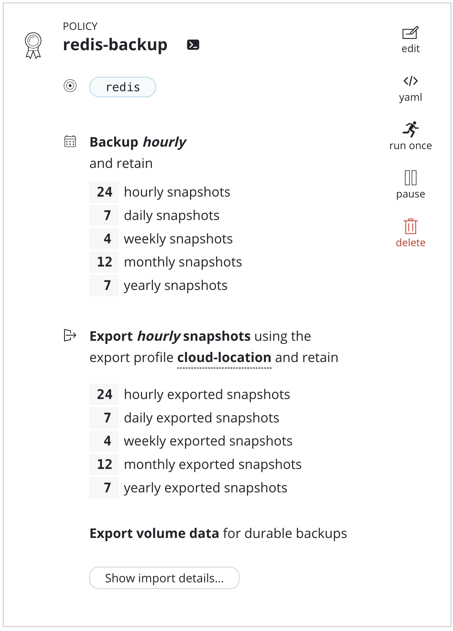 Import policies are only supported for importing applications into a cluster that is different than where the application was captured from. The protecting applications section has more details.