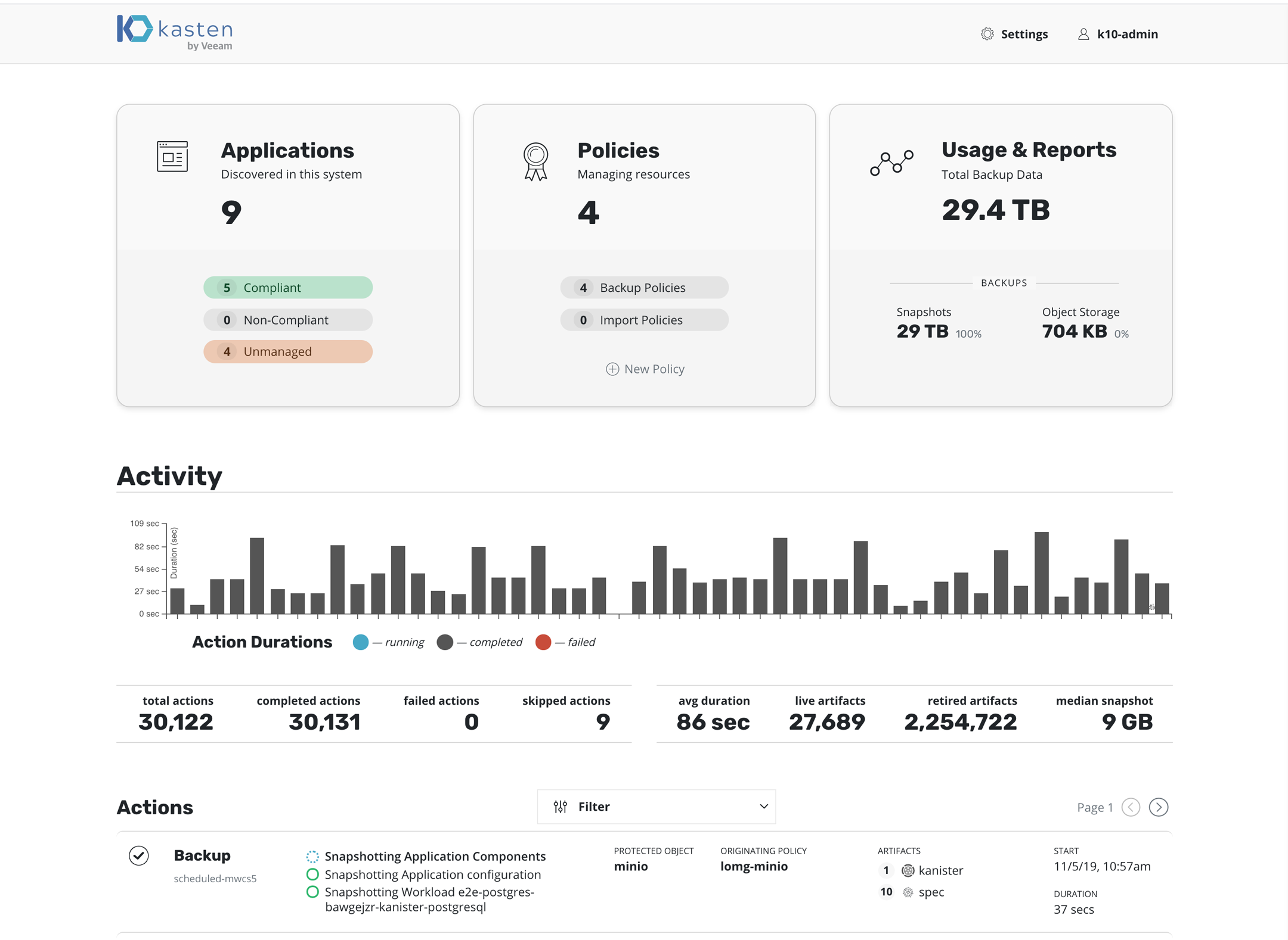 Once you have created a policy and have navigated back to the main dashboard, you will see the selected applications quickly switch from unmanaged to non-compliant (i.e., a policy covers the objects but no action has been taken yet). They will switch to compliant as snapshots and backups are run as scheduled or manually and the application enters a protected state. You can also scroll down on the page to see the activity, how long each snapshot took, and the generated artifacts. Your page will now look similar to this: