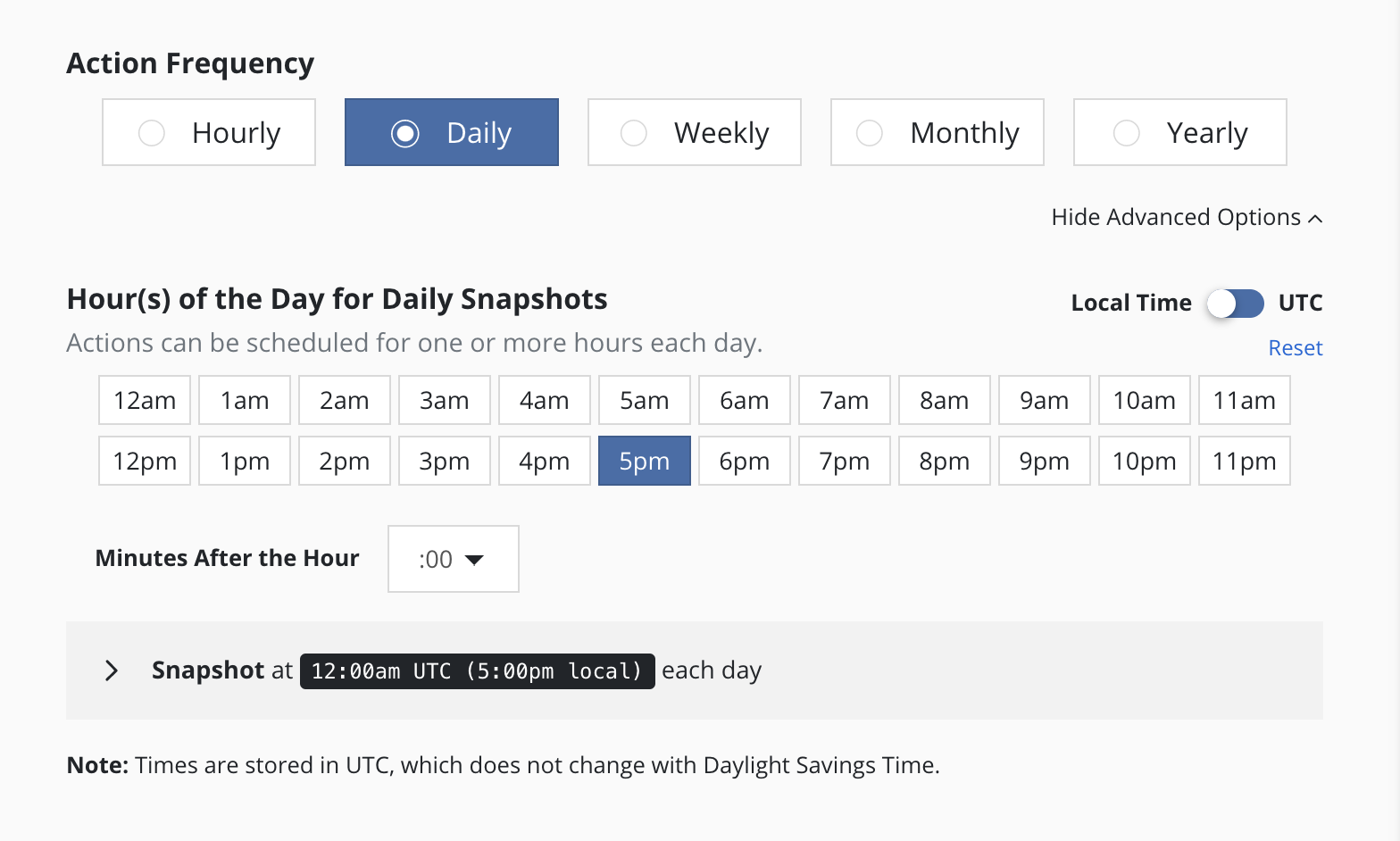 The Advanced Options settings allows a user to display and enter times in either local time or UTC. All times are converted to UTC and K10 policy schedules do not change for daylight savings time.