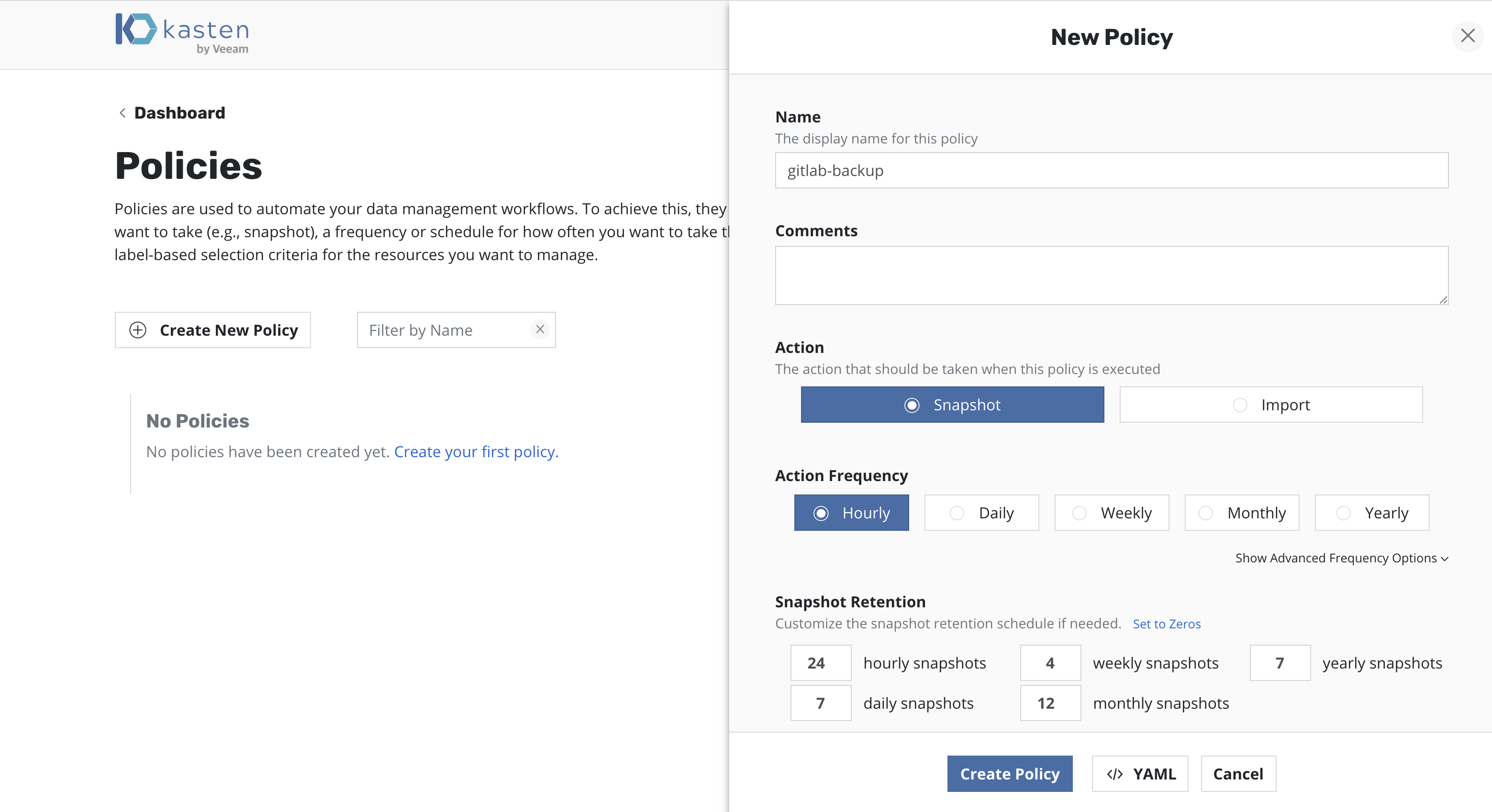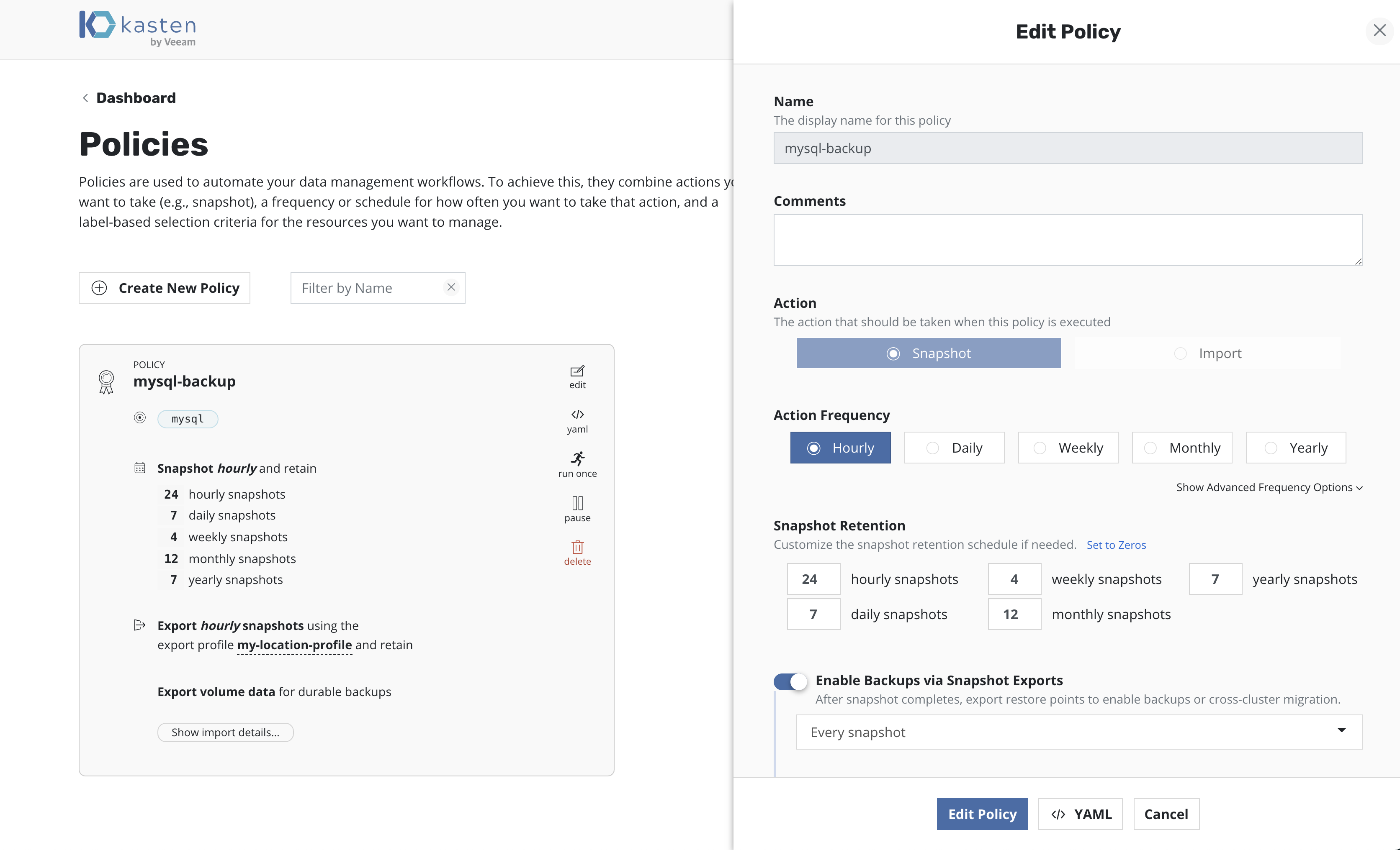 All policies center around the execution of actions and, for protecting applications, you start by selecting the snapshot action with an optional backup (currently called export) option to that action.