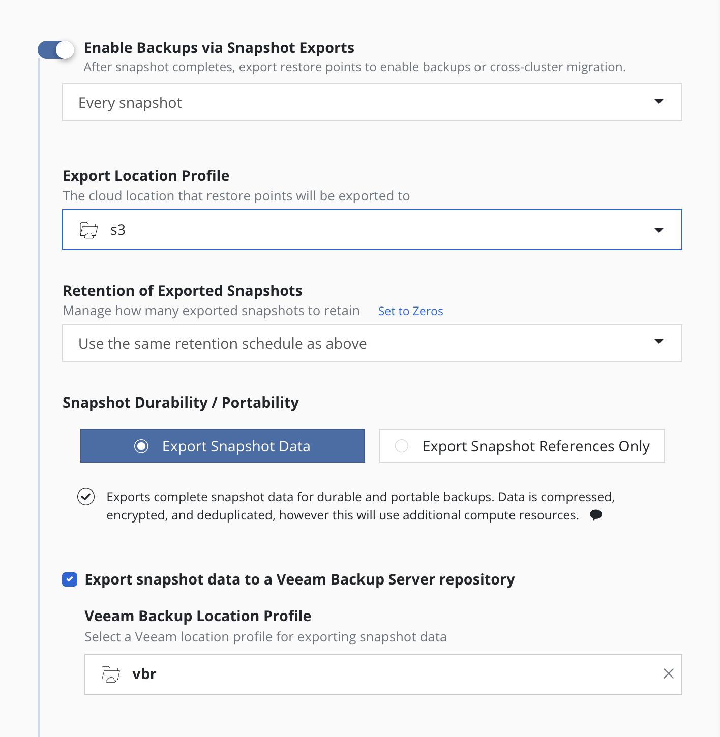 Care should be taken when disabling backup/exports from a policy. If no independent export retention schedule existed, no new exports will be created and the prior exports will be retired as before. The exported artifacts will be retired in the future at the same time as the snapshot artifacts from each policy run.