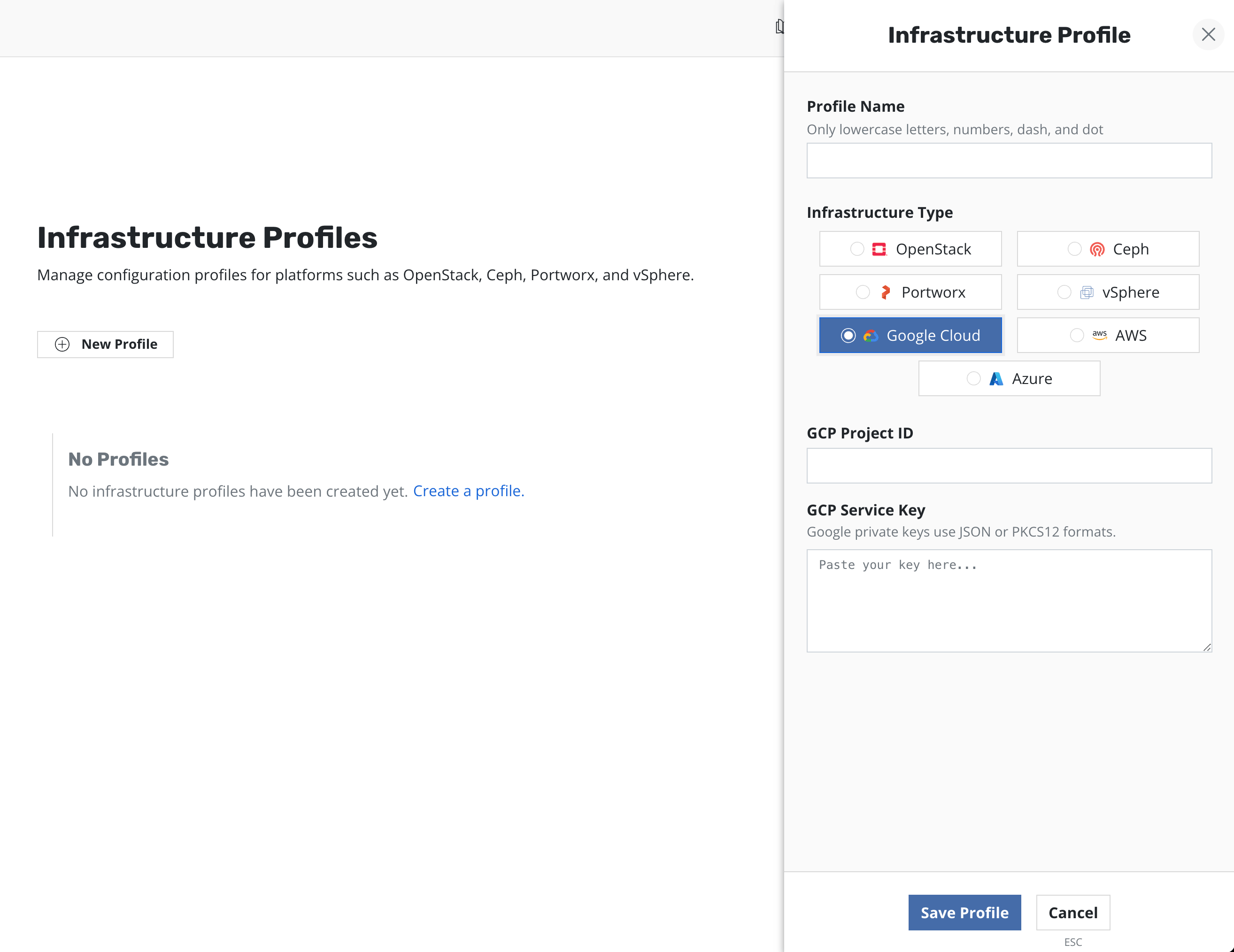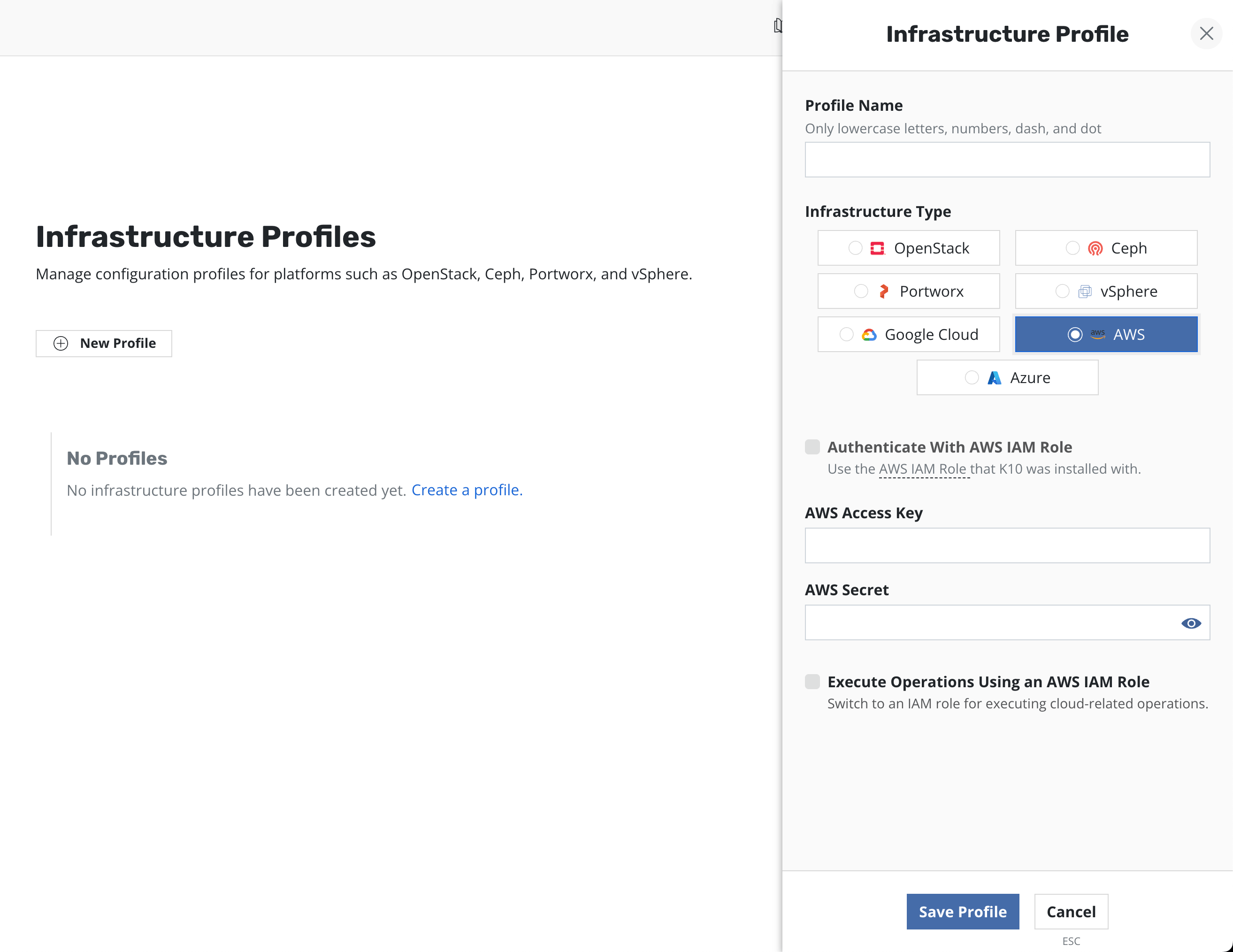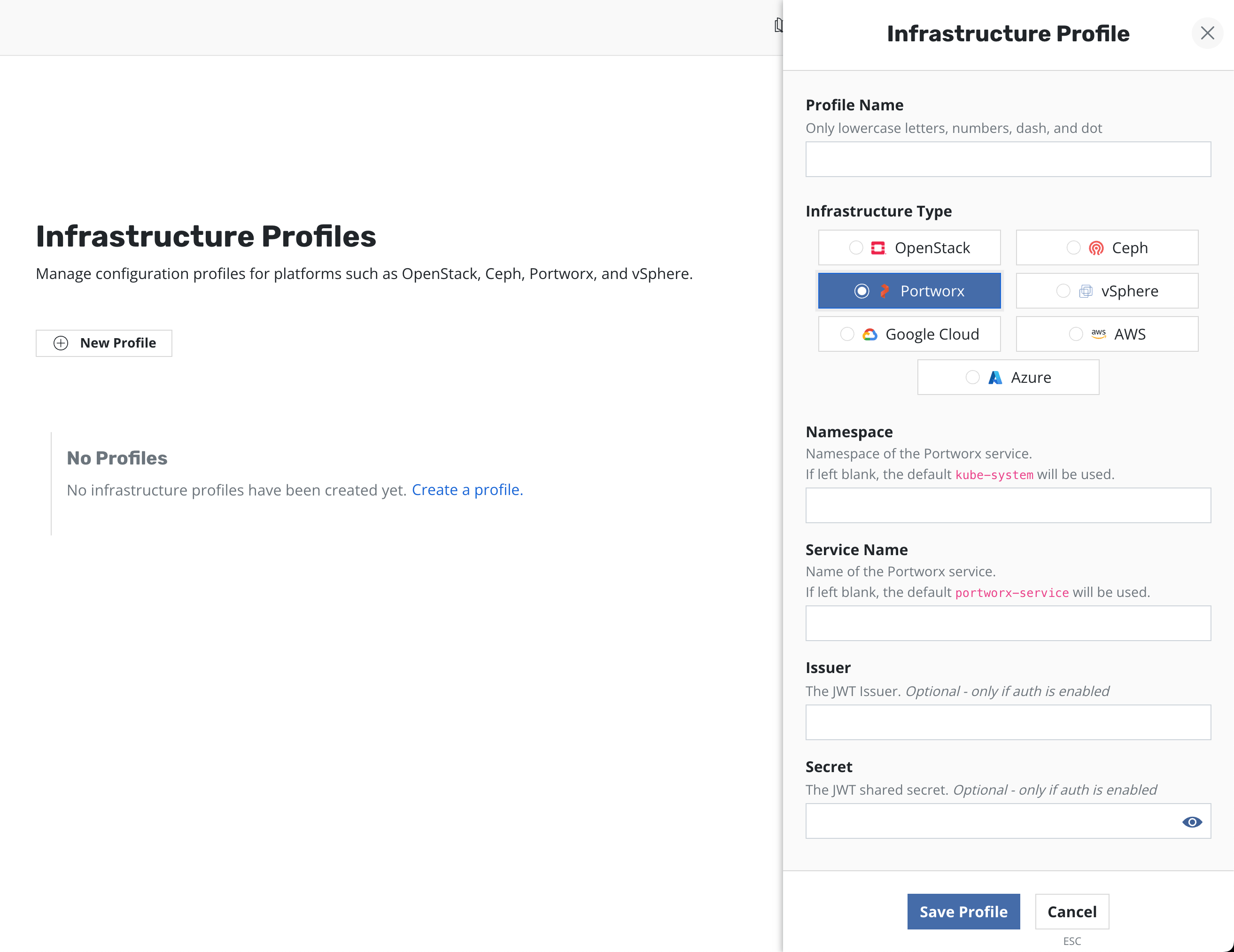 To enable K10 to take snapshots and restore volumes from Portworx, an Infrastructure Profile must be created from the settings menu.