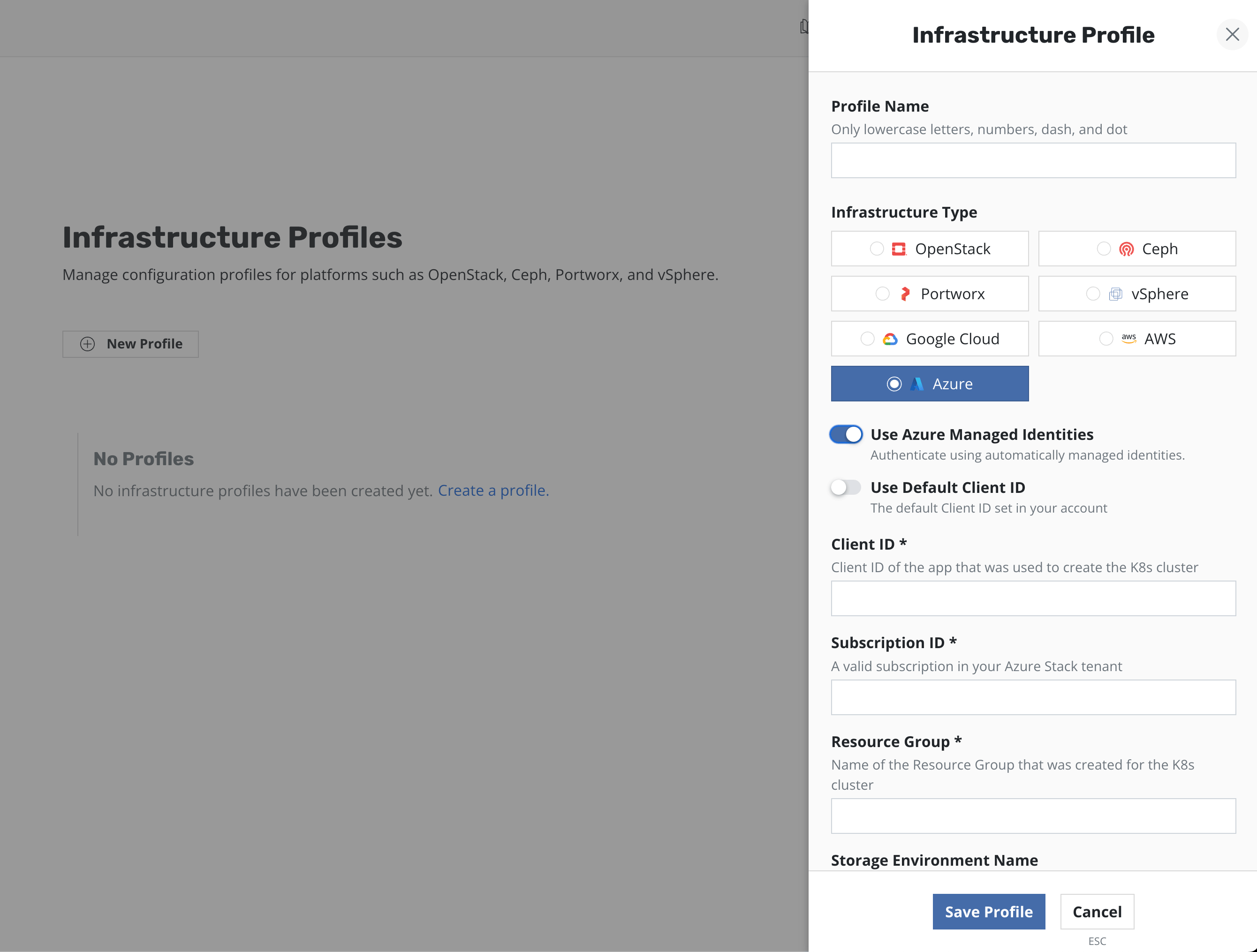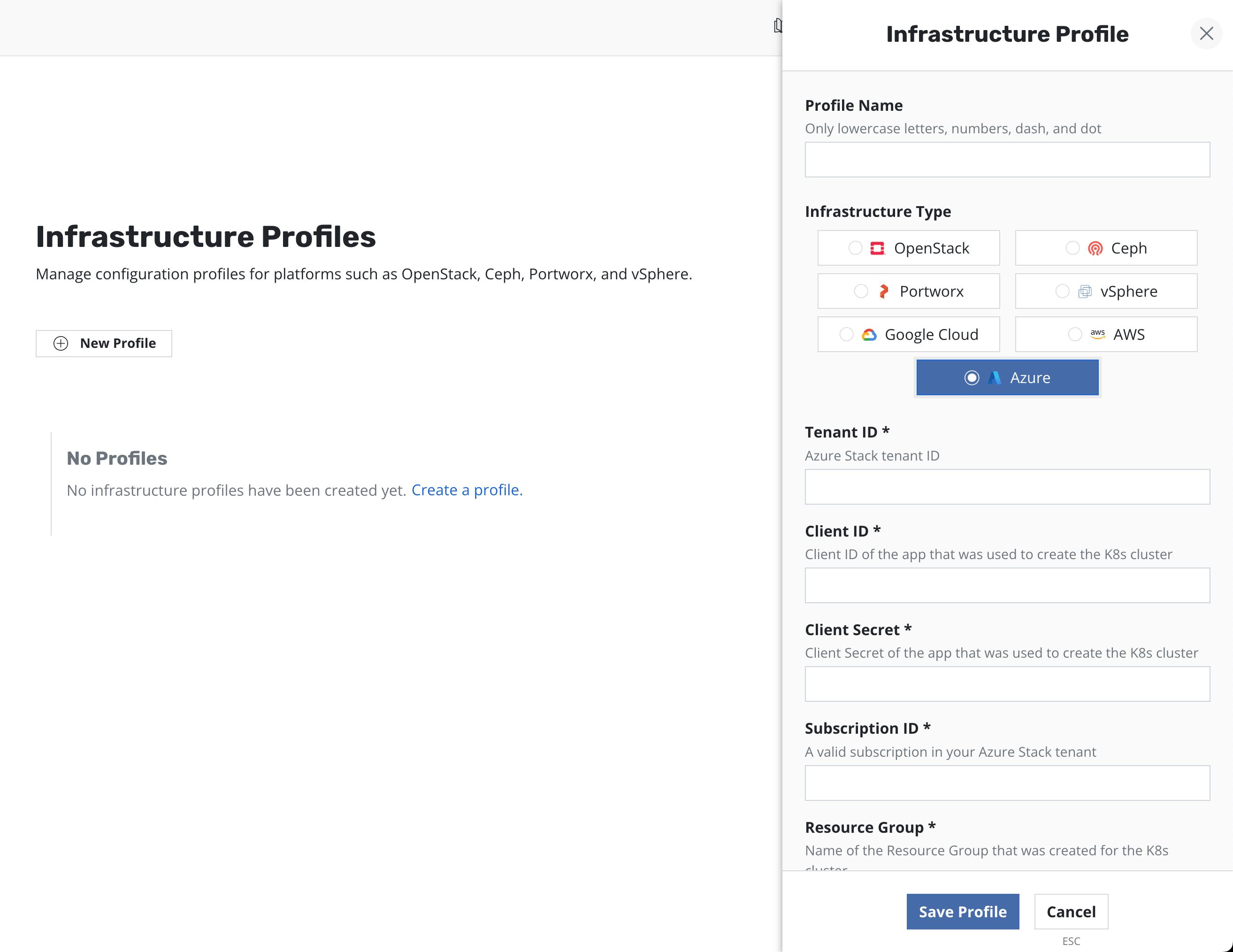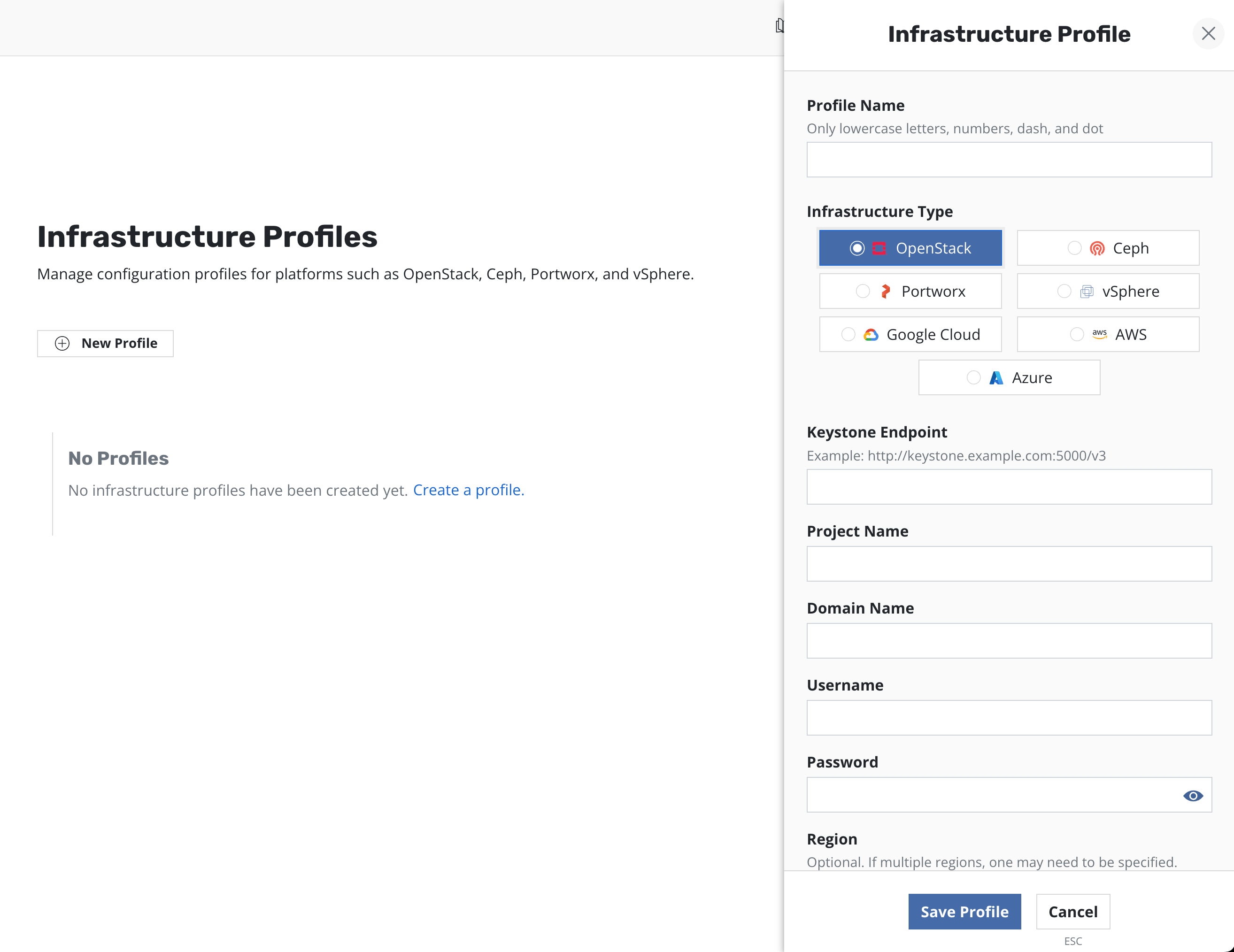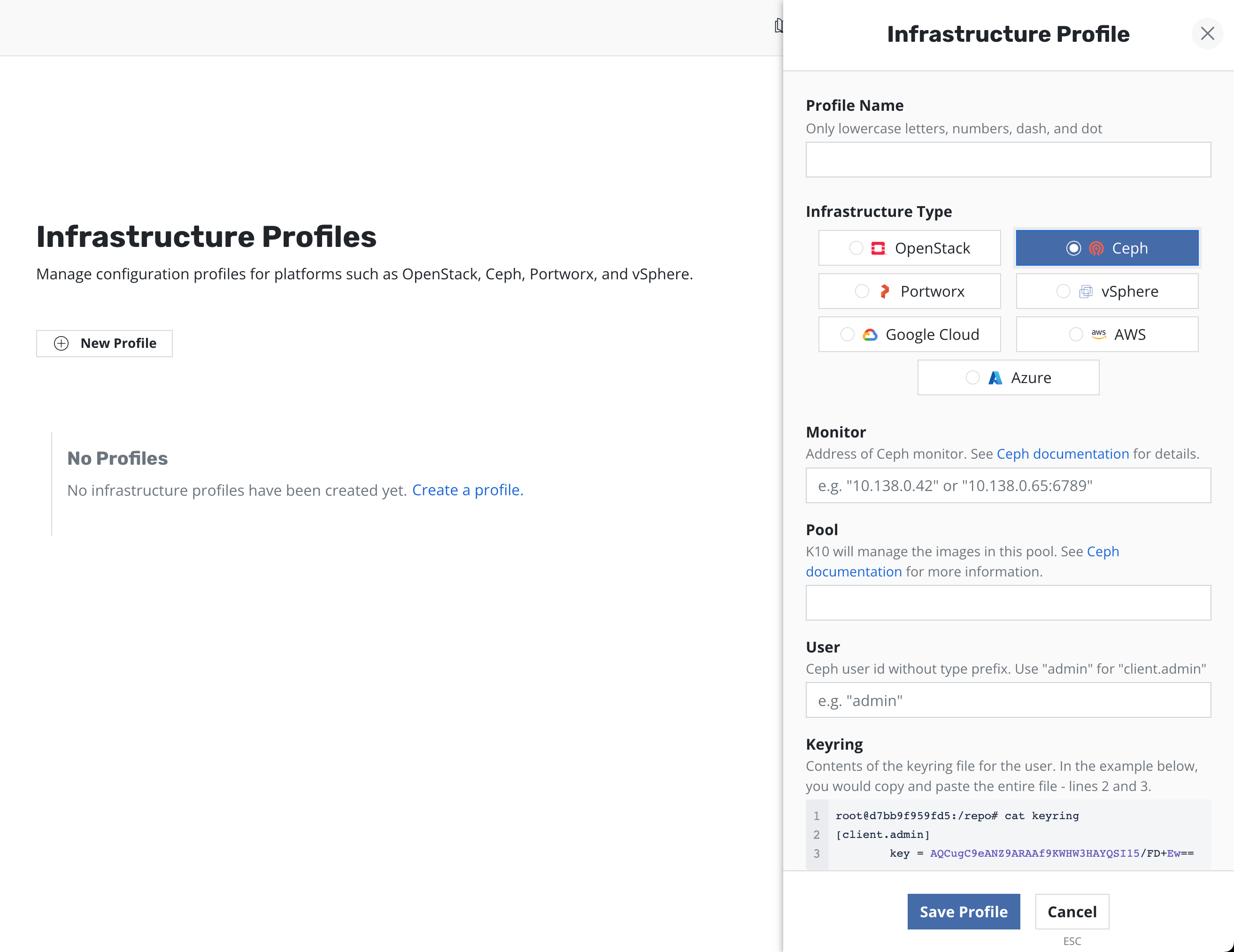 To enable K10 to take snapshots and restore volumes from Portworx, an Infrastructure Profile must be created from the settings menu.