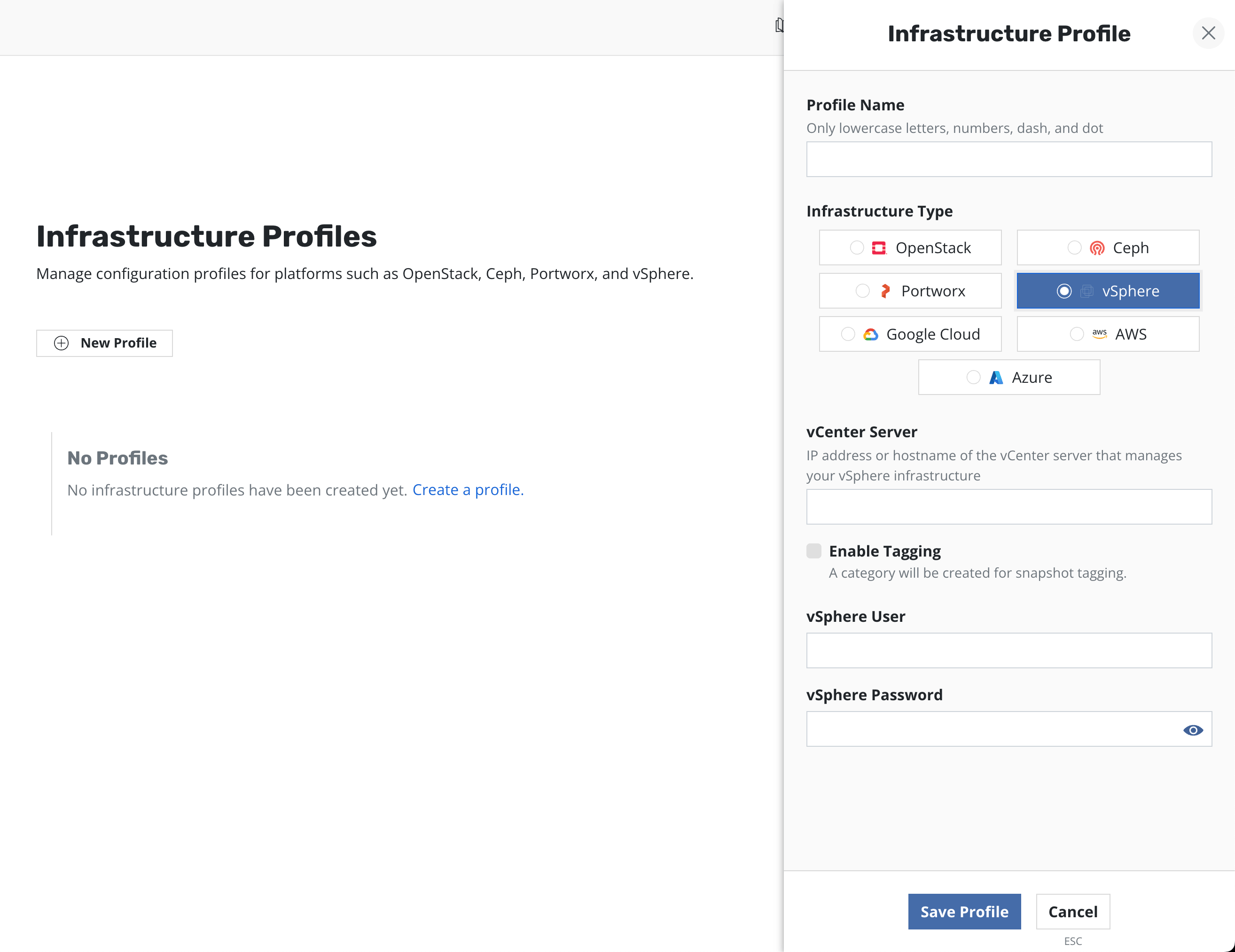 A vSphere Infrastructure Profile must be created from the Settings menu to identify the vCenter server.