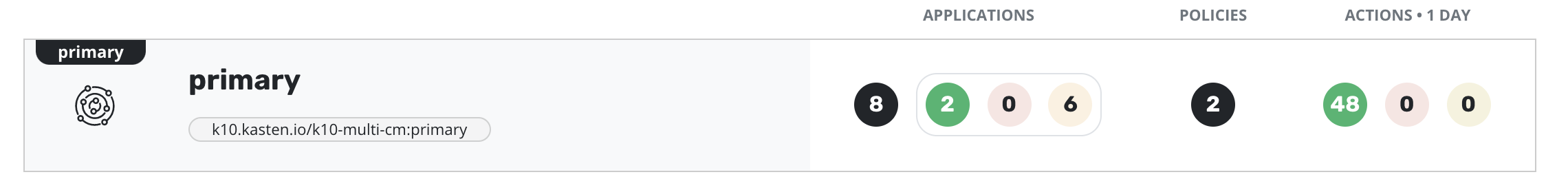 K10 Multi-Cluster Manager allows for an aggregated view of all clusters configured in the system. Clusters can be filtered by name or labels. Each cluster displays application, policy and actions information. Each cluster can also be clicked through and explored individually.
