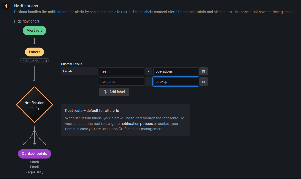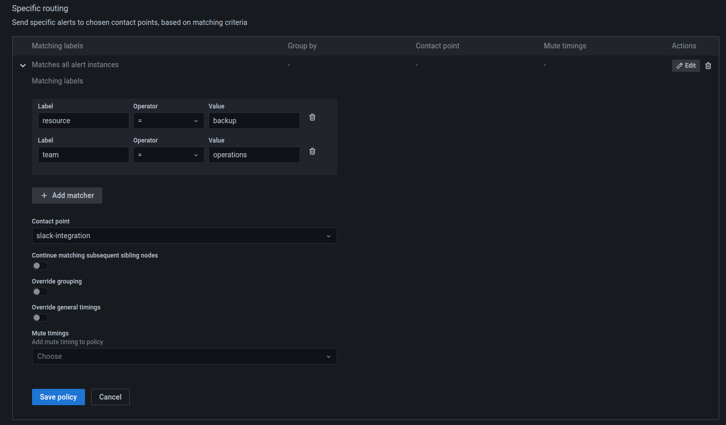 Once the alerts rule and contact points have been configured, the relationship between these two configurations is established by creating a Notification policy.