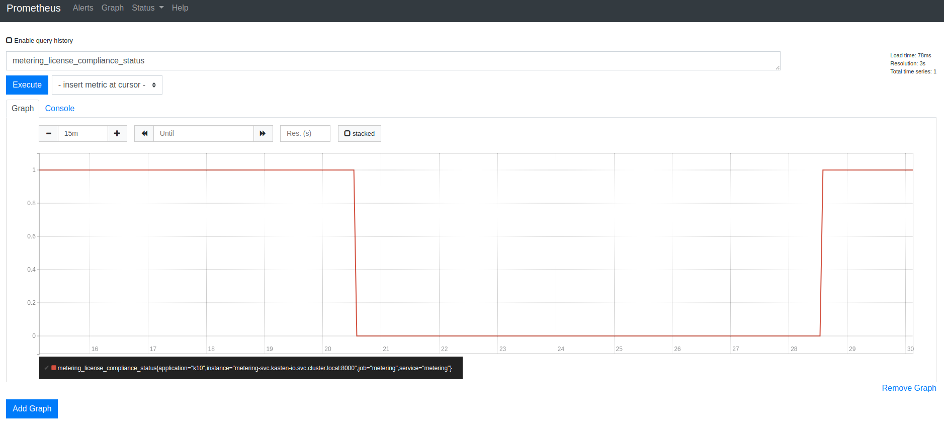 metering_license_compliance_status metric can be queried and graphed.