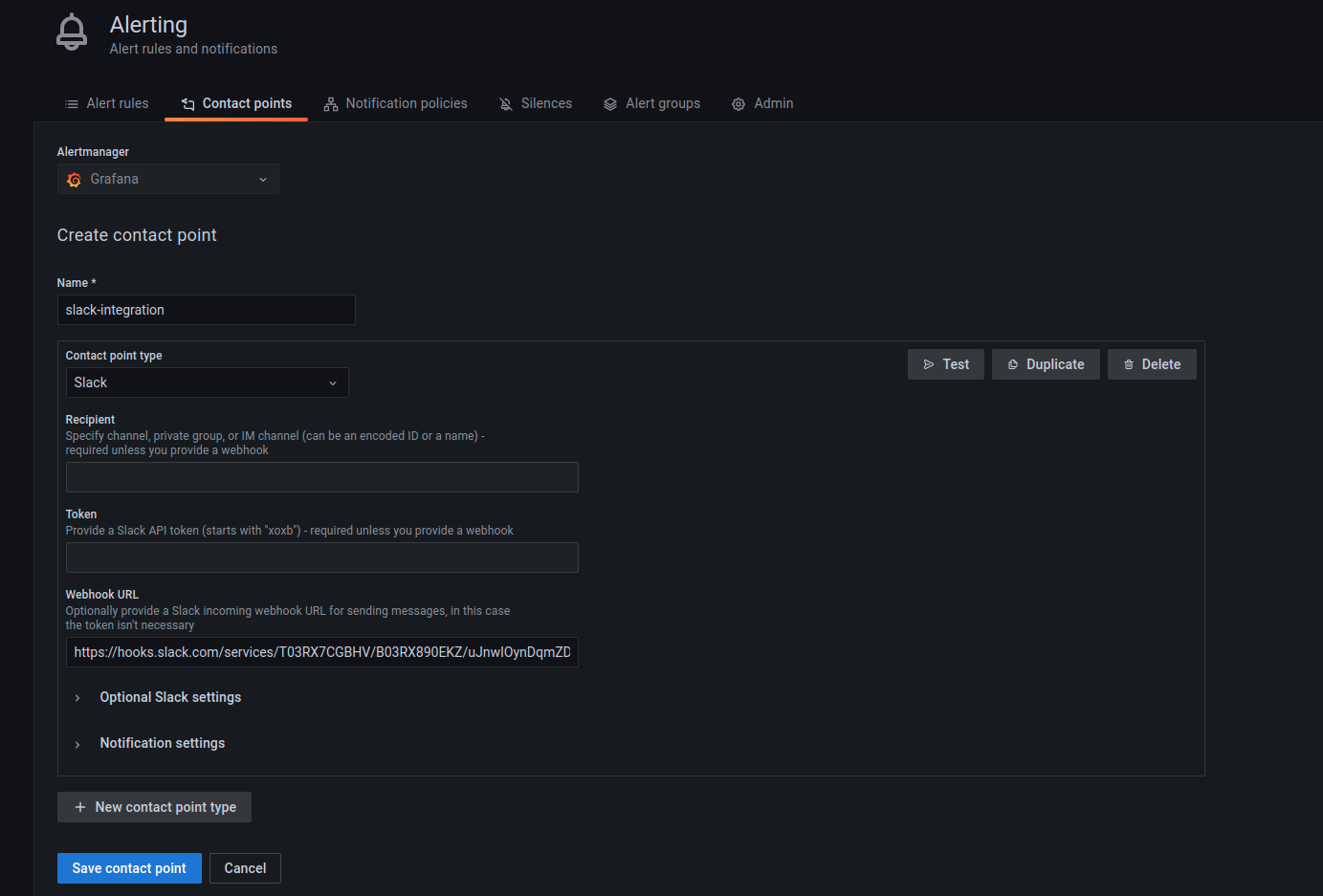 Contact points are used to configure the communication medium for the alerts that are going to be generated. For example, in some scenarios, it might be useful to get a slack message as soon as an alert is fired. In that case, slack must be configured as a contact point. To see a list of all the contact point types, refer to this Grafana documentation.