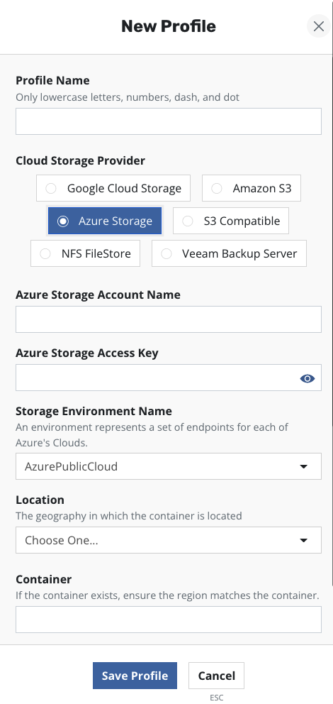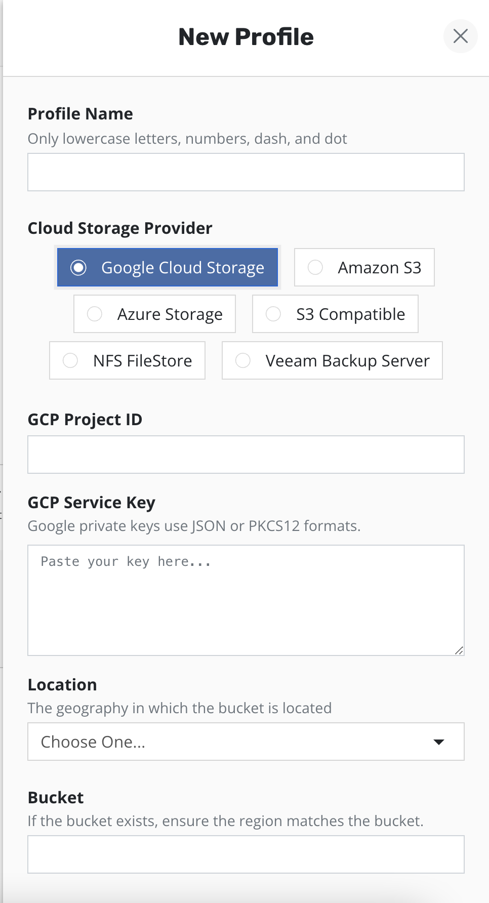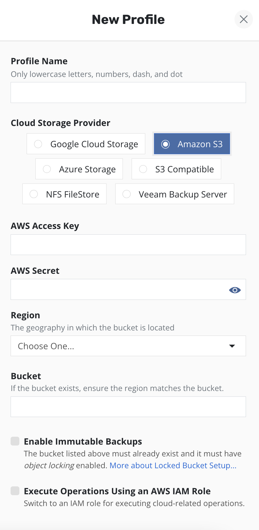 Once a bucket has been prepared with each of these requirements met, a profile can be created from the K10 dashboard to point to it.