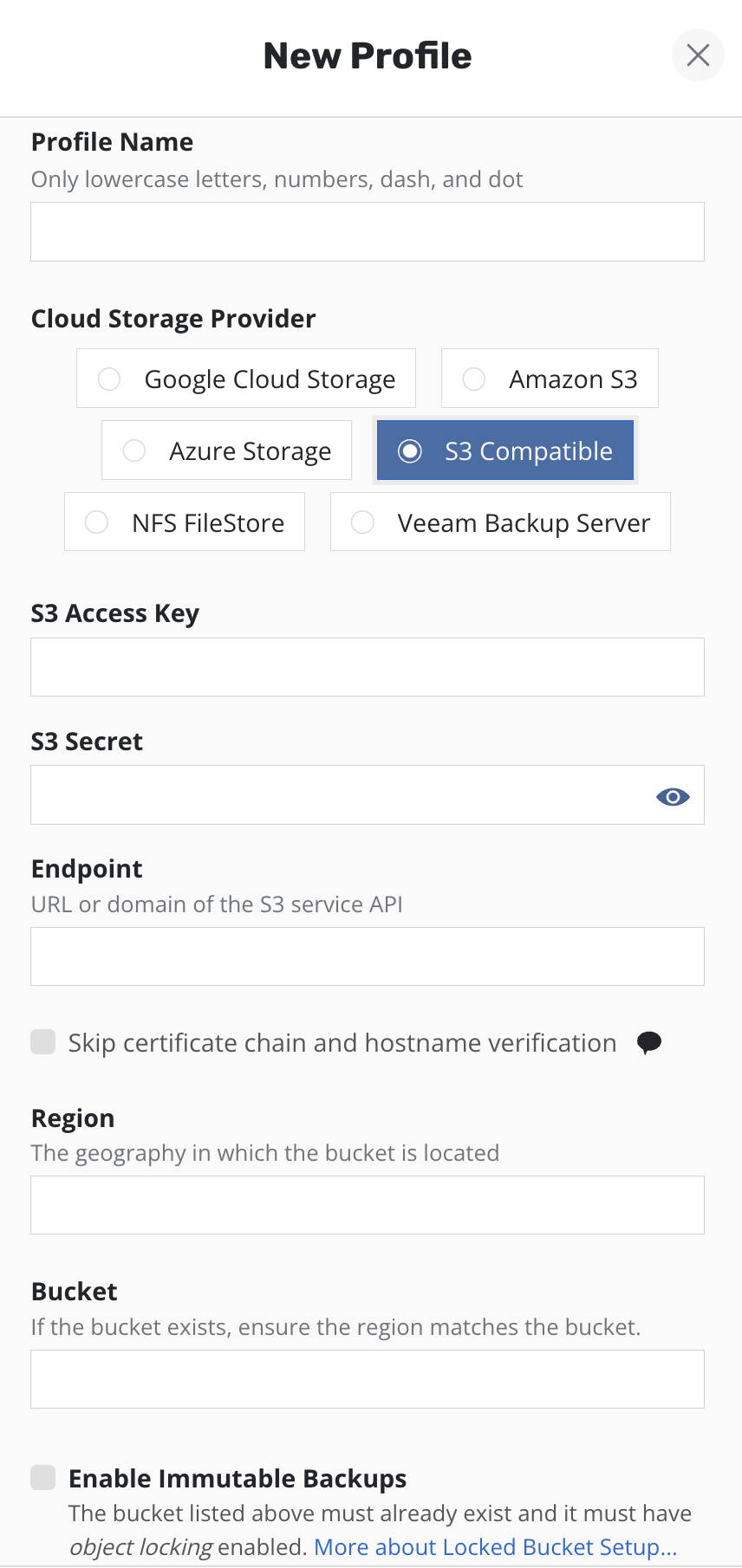 After selecting the checkbox labeled "Enable Immutable Backups" a new button labeled "Validate Bucket <bucket-name>" will appear. Click the Validate Bucket button to initiate a series of checks against the bucket, verifying the bucket can be reached and meets all of the requirements denoted above. All conditions must be met for the check to succeed and for the profile form to be submitted.