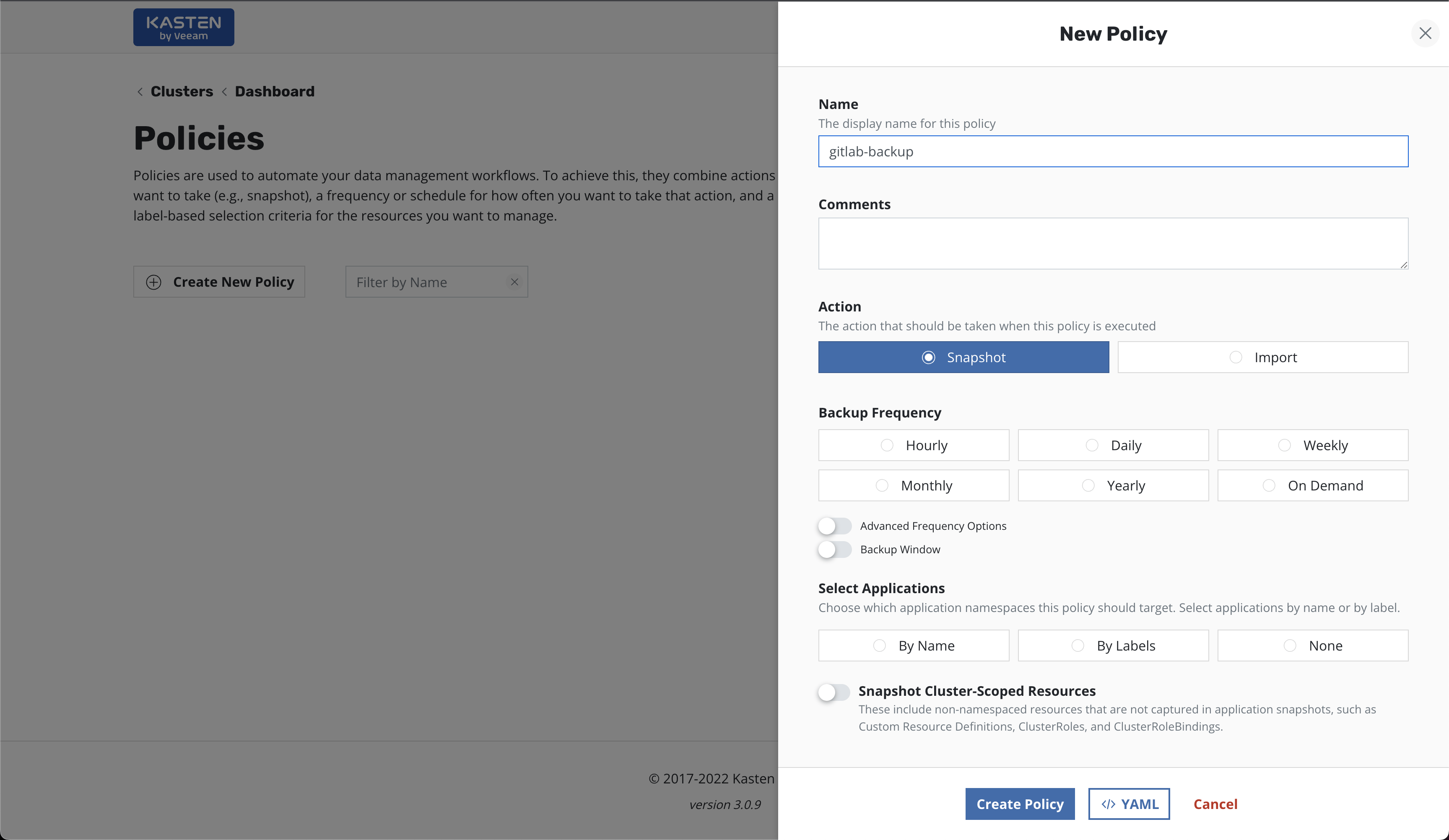 All policies center around the execution of actions and, for protecting applications, you start by selecting the snapshot action with an optional backup (currently called export) option to that action.