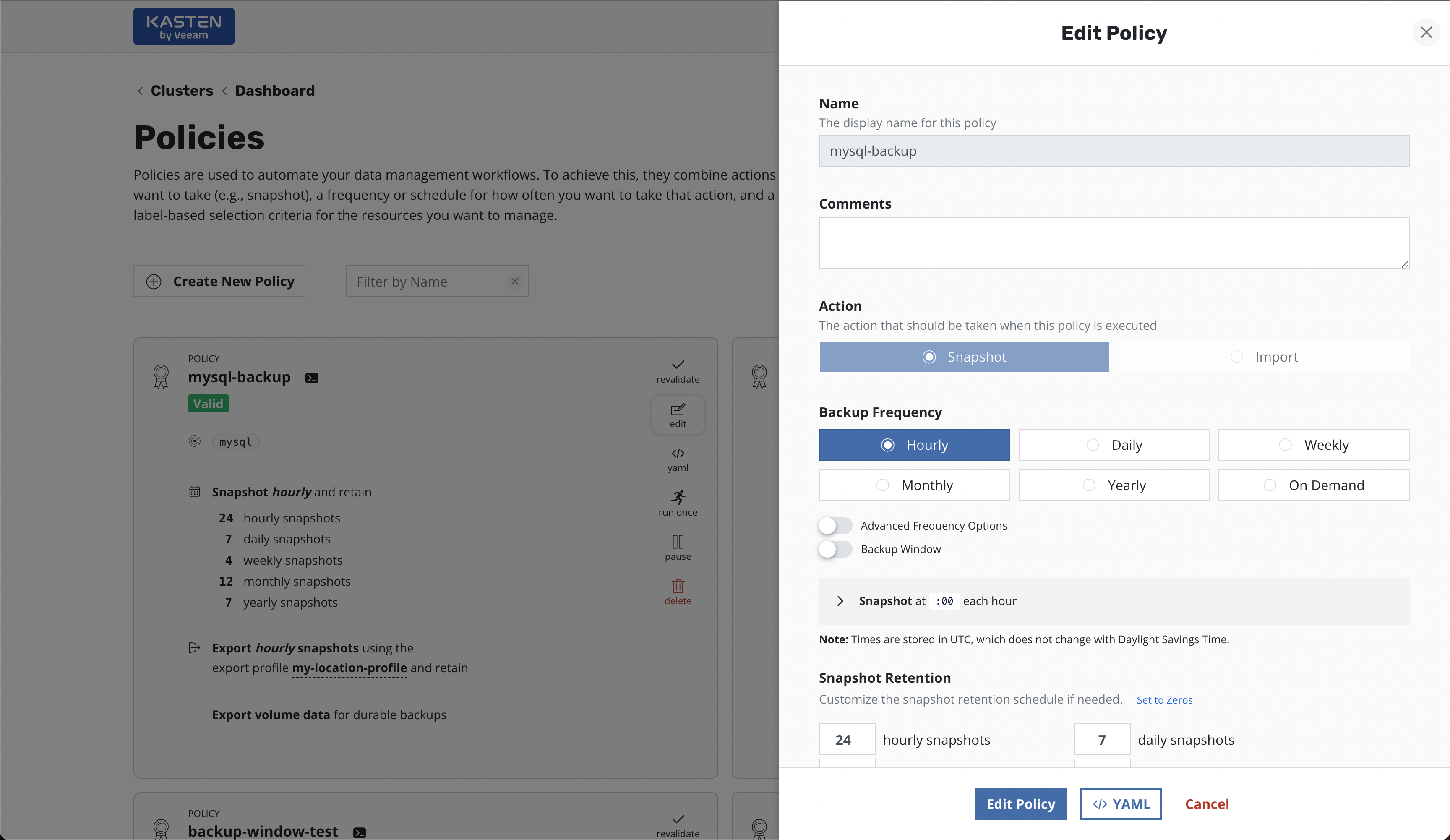 A powerful scheduling feature in K10 is the ability to use a GFS retention scheme for cost savings and compliance reasons. With this backup rotation scheme, hourly snapshots and backups are rotated on an hourly basis with one graduating to daily every day and so on. It is possible to set the number of hourly, daily, weekly, monthly, and yearly copies that need to be retained and K10 will take care of both cleanup at every retention tier as well as graduation to the next one. For on demand policies it is not possible to set a retention schedule.