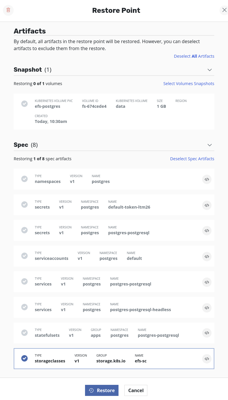 Applications→your_namespace→RestoreSelect a restore point. From details, deselectSpec Artifactsand deselectVolume Snapshots. Only the StorageClass has to be restored first and therefore only that should be selected from the list of specs. ClickRestore.Once the restore job is successful, volumes can be restored. To accomplish that, select the same restore point as before but this time,