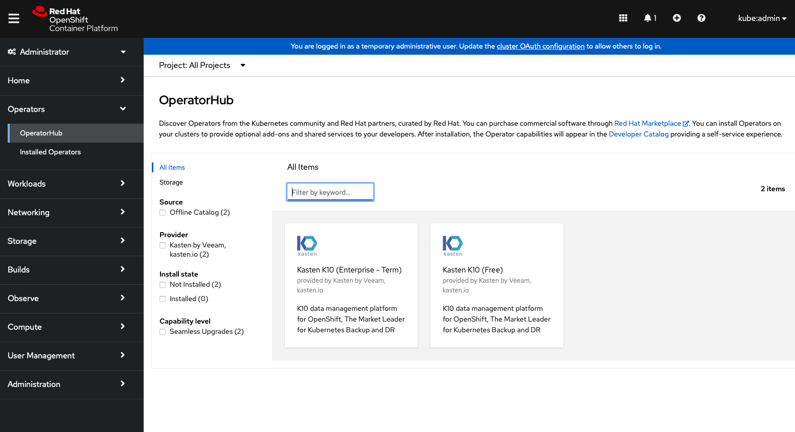 Select the OperatorHub from the Operators Menu, search for Kasten. Select either the Certified Operator, or Marketplace version depending on the requirements