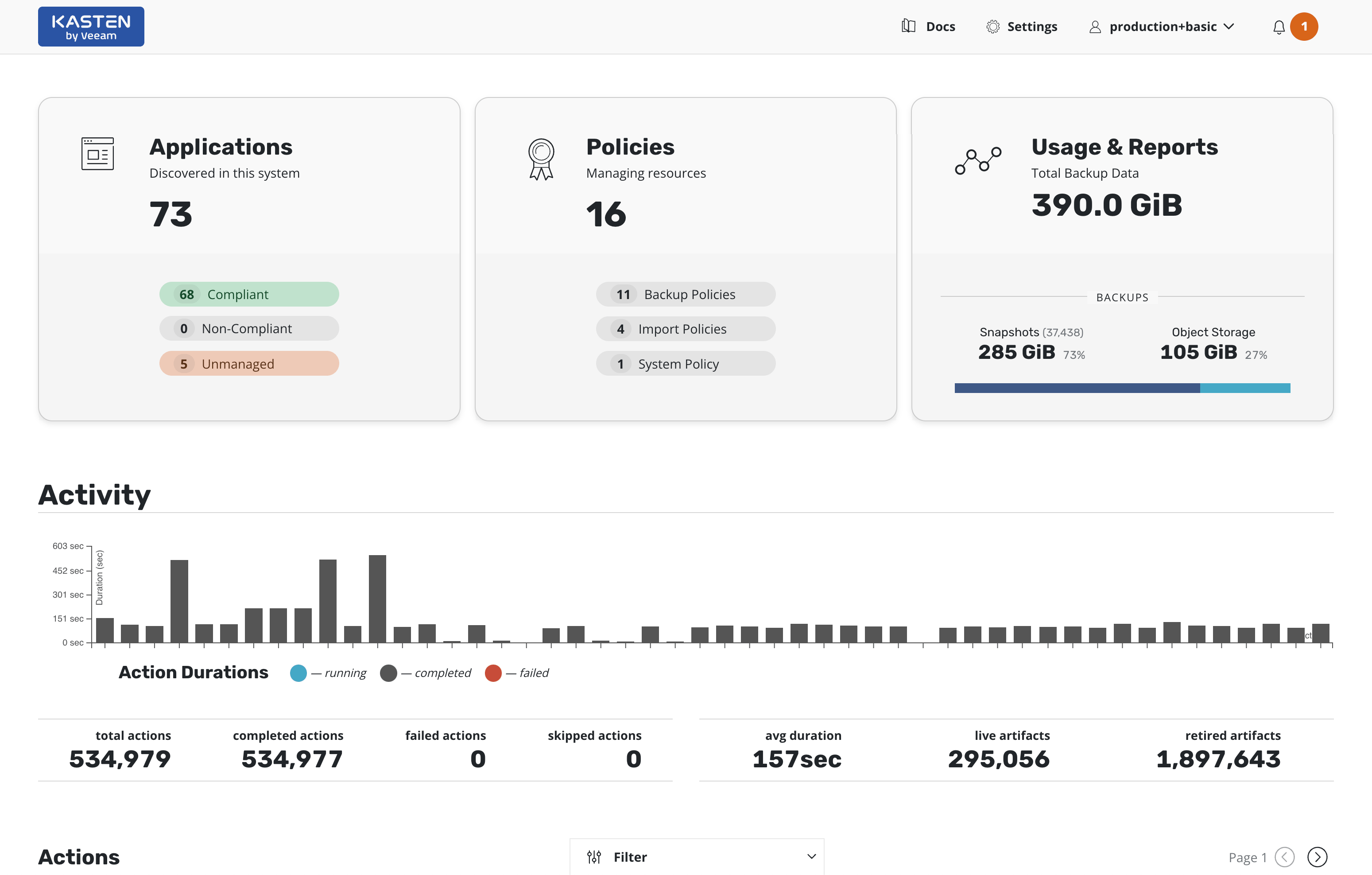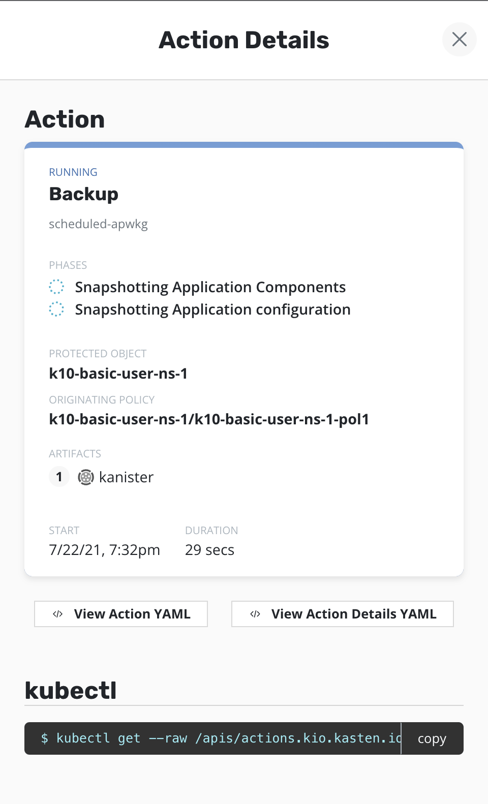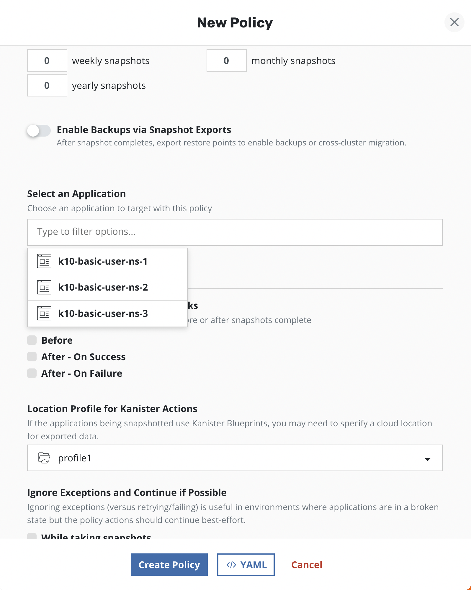 Users who are not administrators can create K10 policies in an application's namespace for protecting only that specific application. The image below shows the dashboard as viewed by a non-admin user who has access to policies.