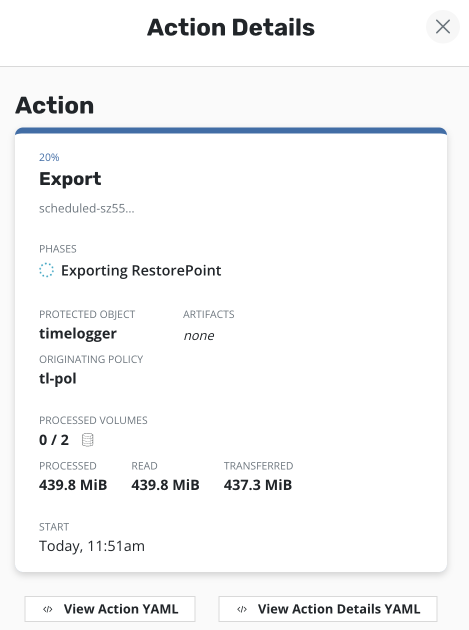 It is possible to monitor the number of processed volumes and the data processed while the export is running via the Action Details view.
