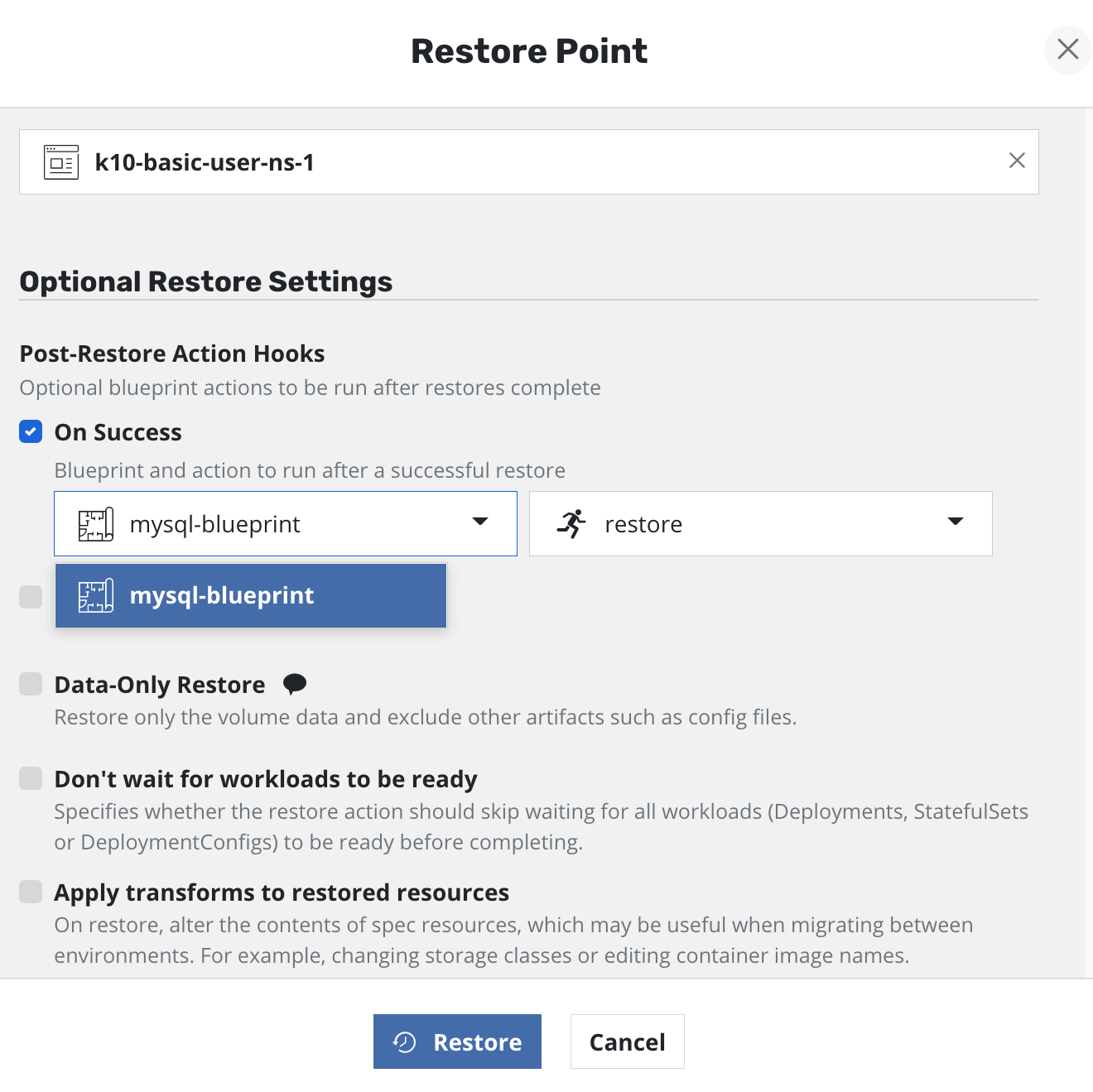 In the Optional Restore Settings section of the restore form, the user can select Kanister blueprint actions that will run after a successful restore. The users of application-scoped policies require read-only access to such blueprints. They depend on the administrator for creation of blueprints. Refer to this page for setting up RBAC to provide access to blueprints in K10's namespace for non-admin users.