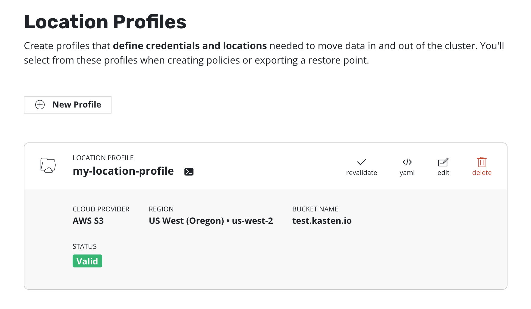 The users of application-scoped policies require read-only access to location profiles. They depend on the administrator for creation of profiles. The image below shows the profiles page as seen by such a user. The user can list/view the profiles that they have been given access to. But they cannot create, edit or delete them. Refer to this page for setting up RBAC to provide access to profiles in K10's namespace for non-admin users.
