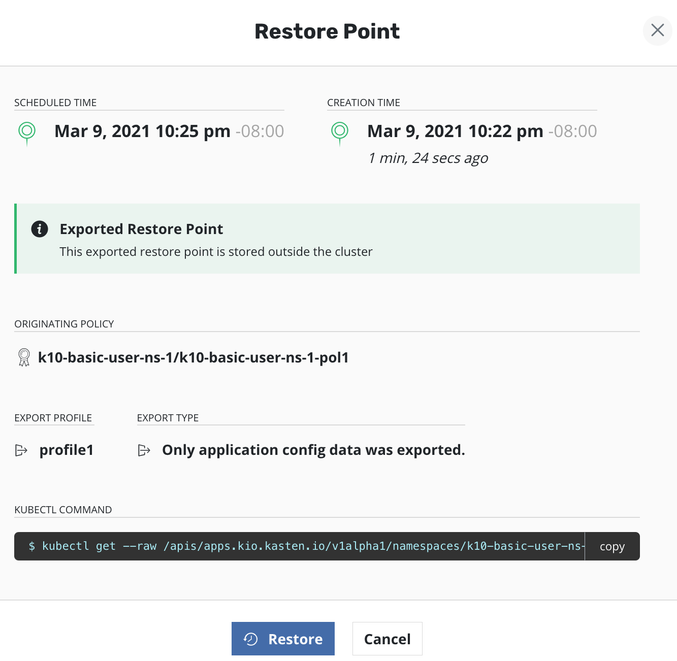The non-admin user can restore the application using one of the Restore Points created by the application-scoped policy. This image below shows an exported Restore Point whose originating policy is an application-scoped policy.