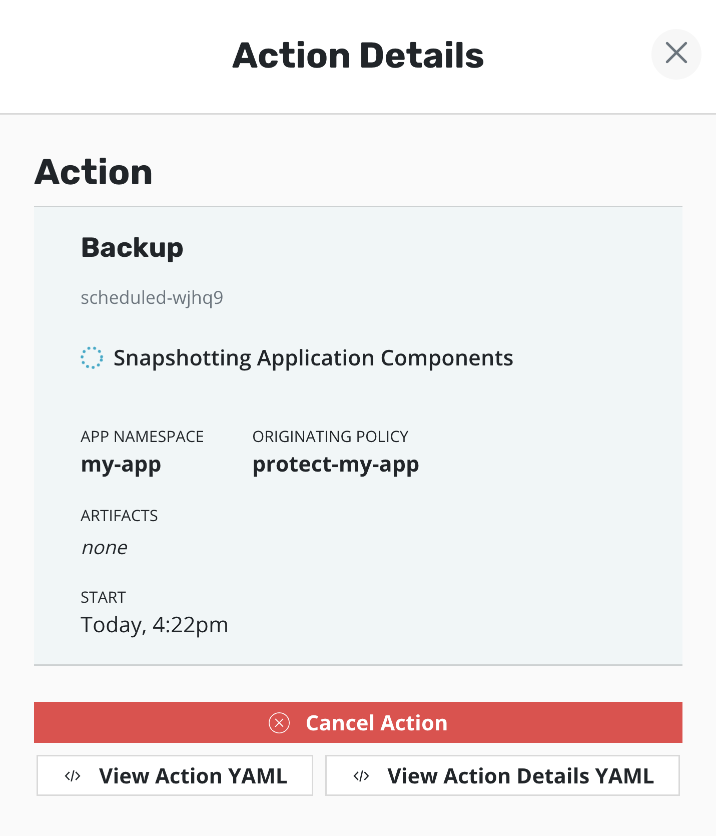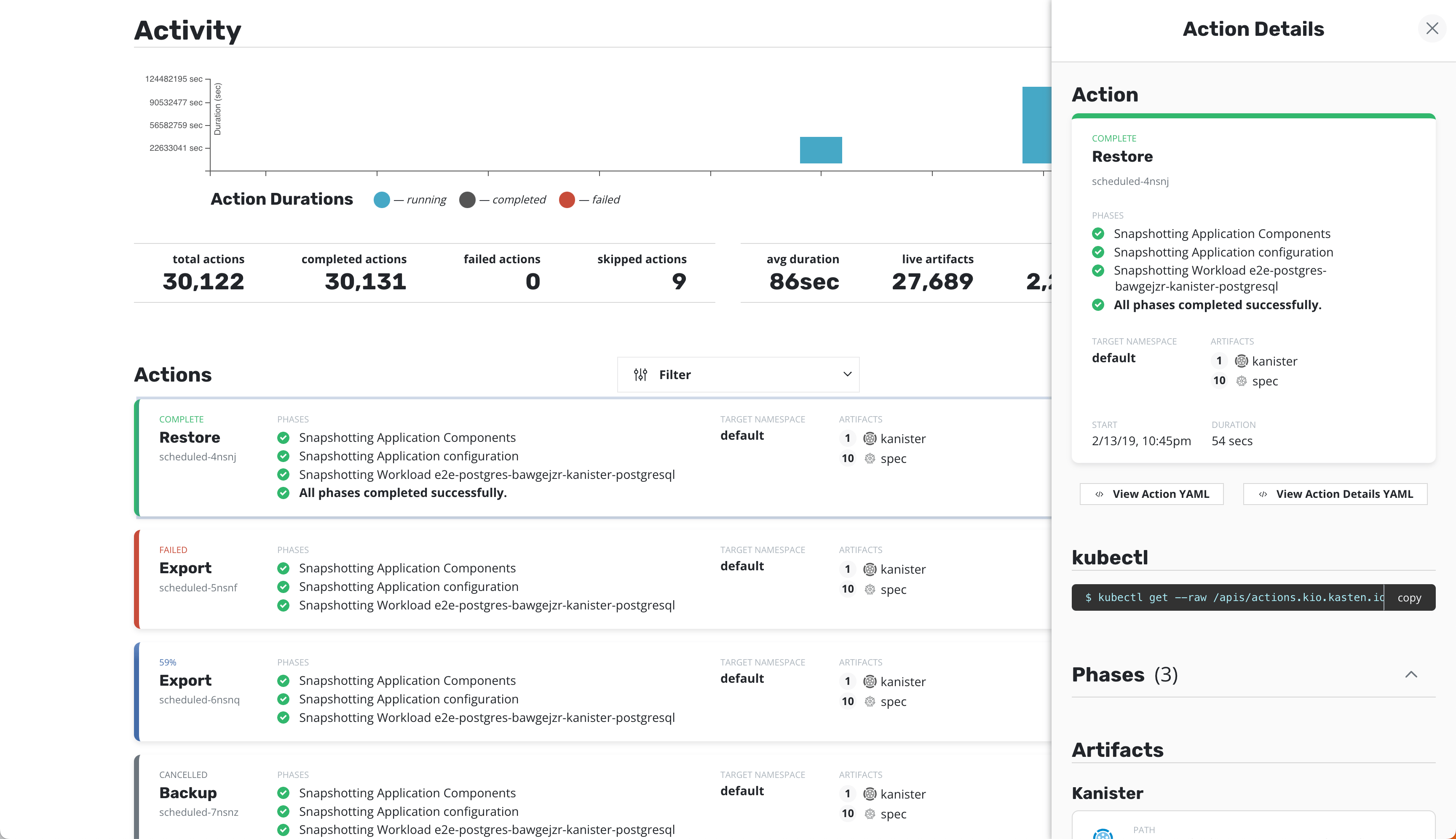 Following the activity and artifact summary, information on recent actions is displayed. This includes the Policy that generated the action which may include the number of child actions, the number of applications included in the Policy run, and start and completion times. The display for manual actions, such as manual snapshots, will be slightly different listing the phases and number of artifacts included in the action. You can also filter the displayed actions by the originating Policy, type of action, failed actions, and completed actions.