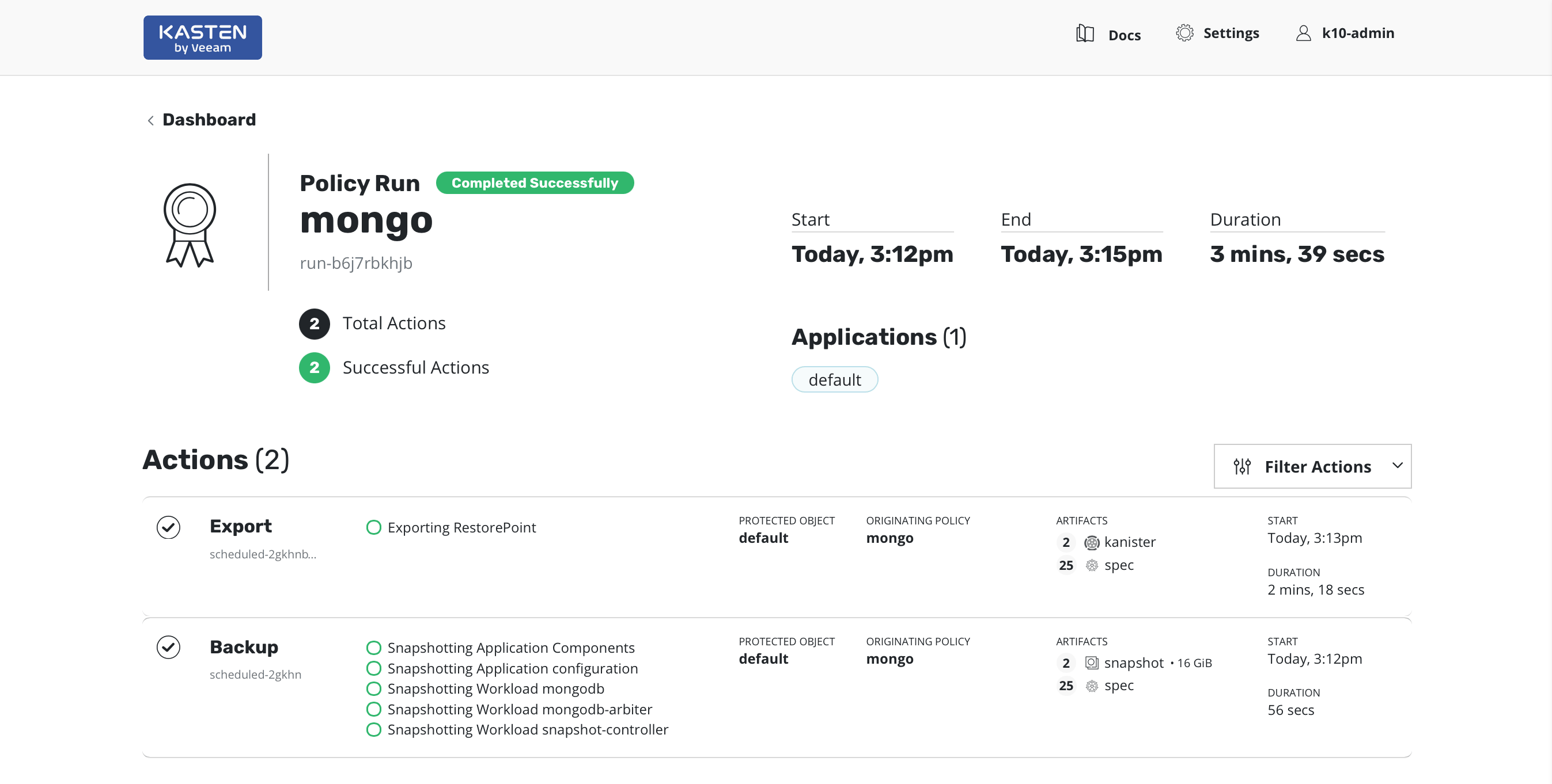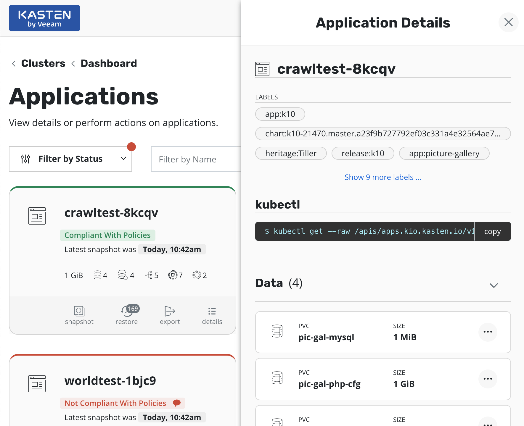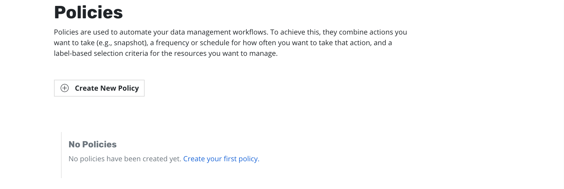 Within K10, policies are used to automate your data management workflows. Going back to the main dashboard, you will find a section on how to manage policies right next to the Applications card. To achieve this, they combine actions you want to take (e.g., snapshot), a frequency or schedule for how often you want to take that action, and selection criteria for the resources you want to manage.