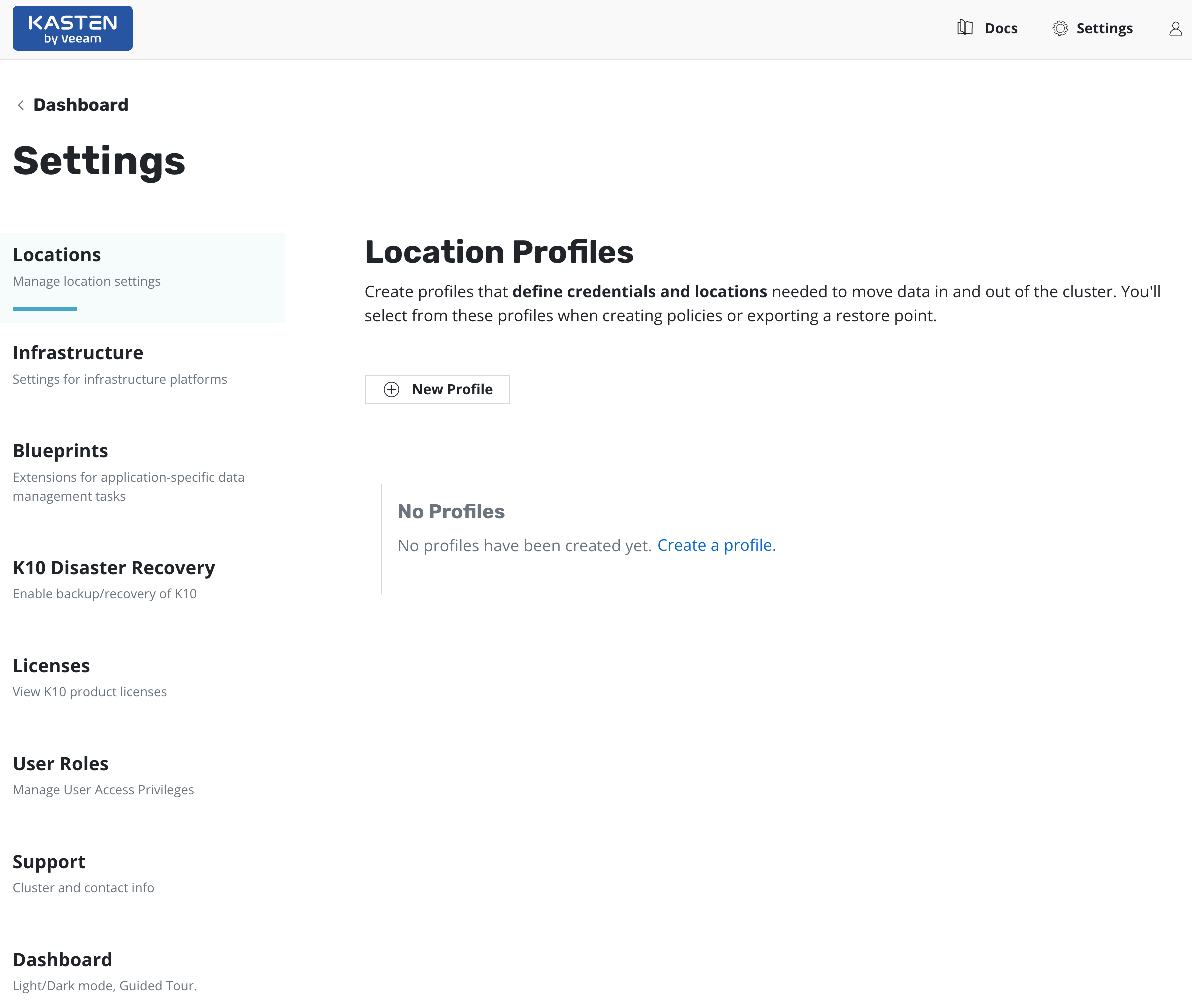 The top of the K10 dashboard displays a list of applications (currently mapped to namespaces), any policies that might exist in the system, and a summary of the cluster's backup data footprint.
