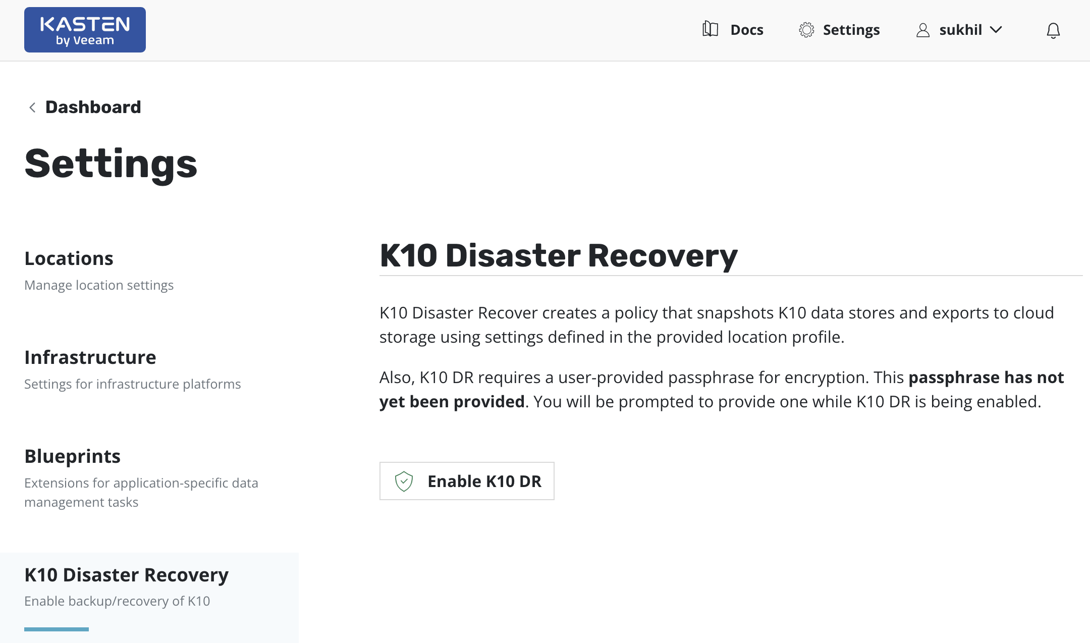 Enable Disaster Recovery by clicking on the Enable K10 DR button.