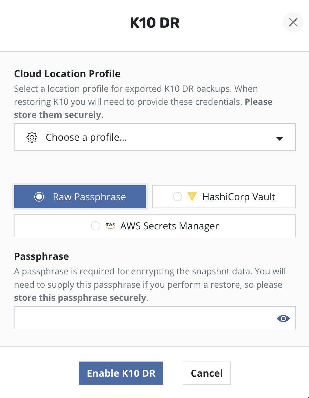 Enabling K10 Disaster Recovery requires selecting a Location Profile for the exported K10 Disaster Recovery backups and providing a passphrase for encrypting the snapshot data.