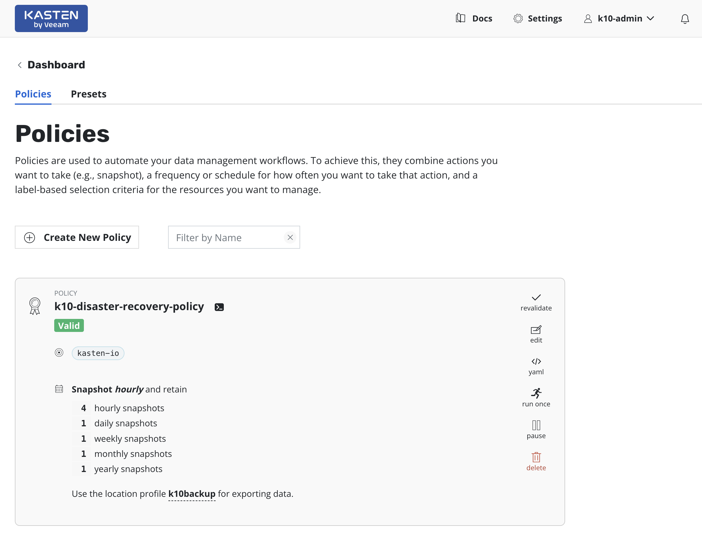 A policy called k10-disaster-recovery-policy which implements K10 Disaster