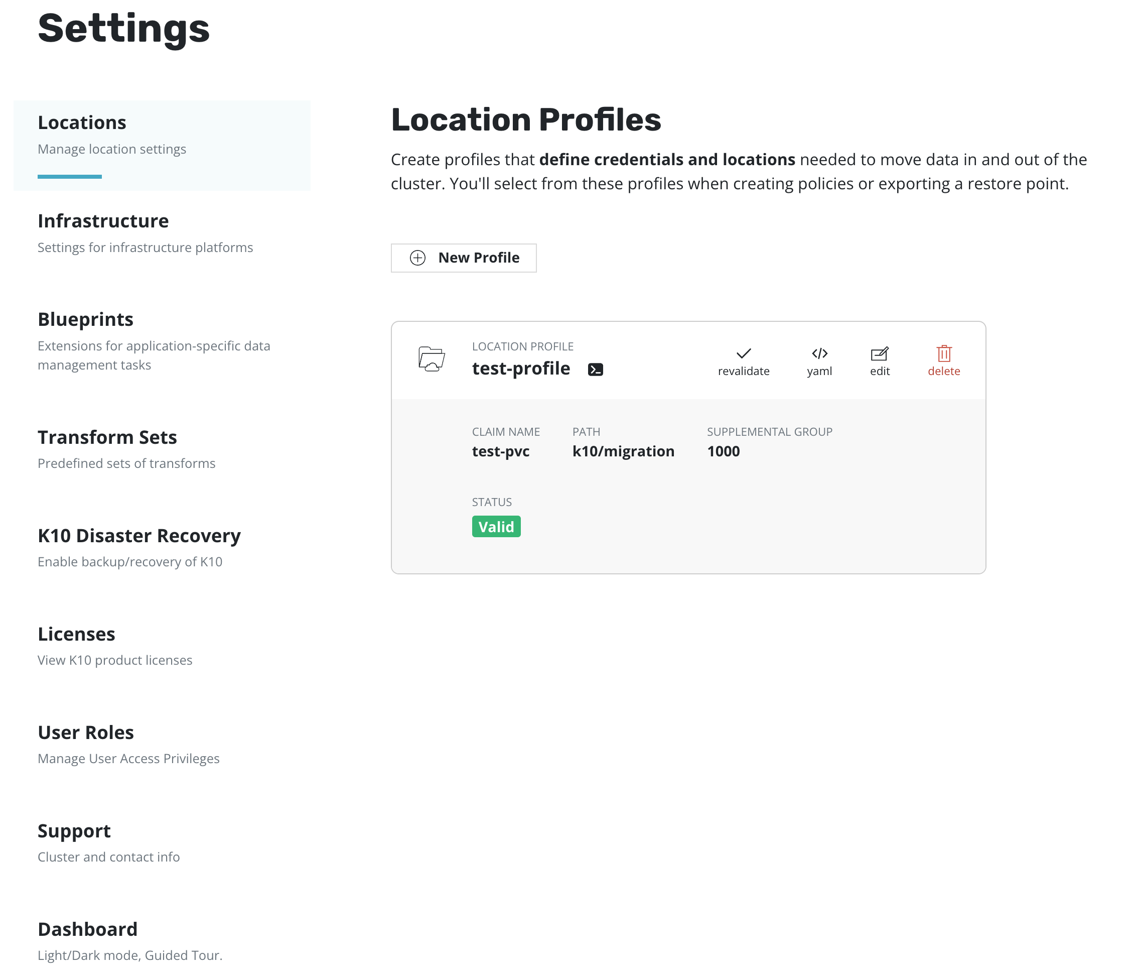 If the location profile is used for exporting an application for cross-cluster migration, it will be used to store application restore point metadata and, when moving across infrastructure providers, bulk data too. Similarly, location profiles are also used for importing applications into a cluster that is different than the source cluster where the application was captured.