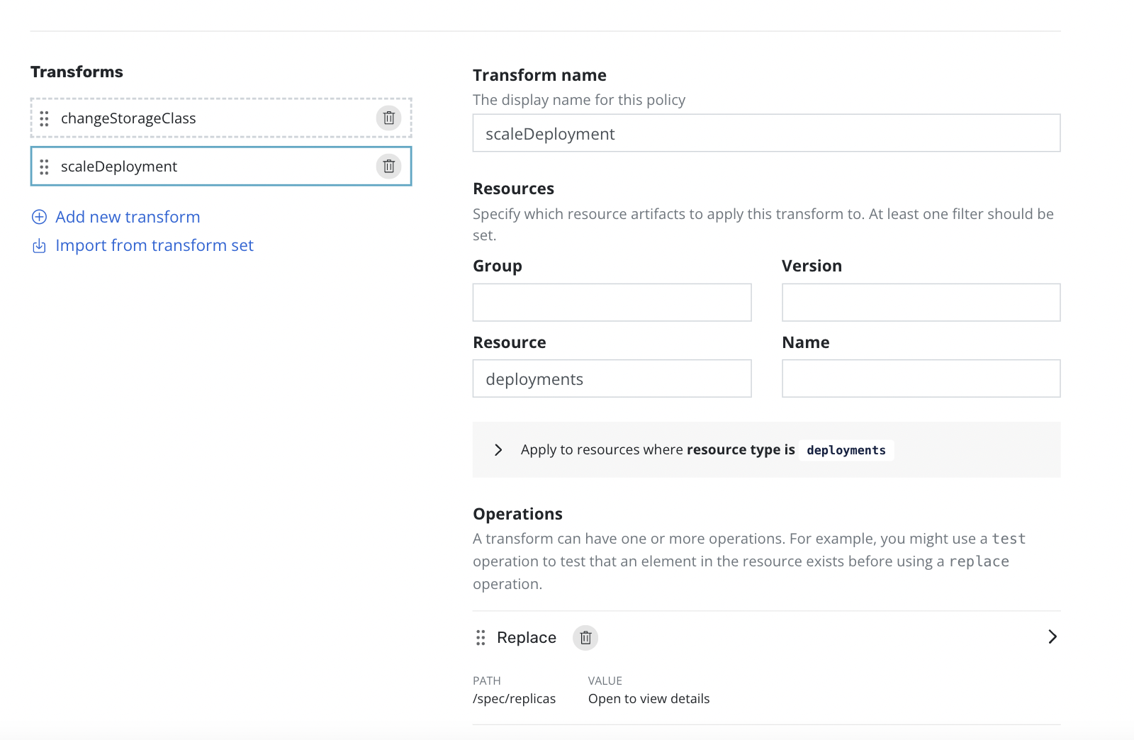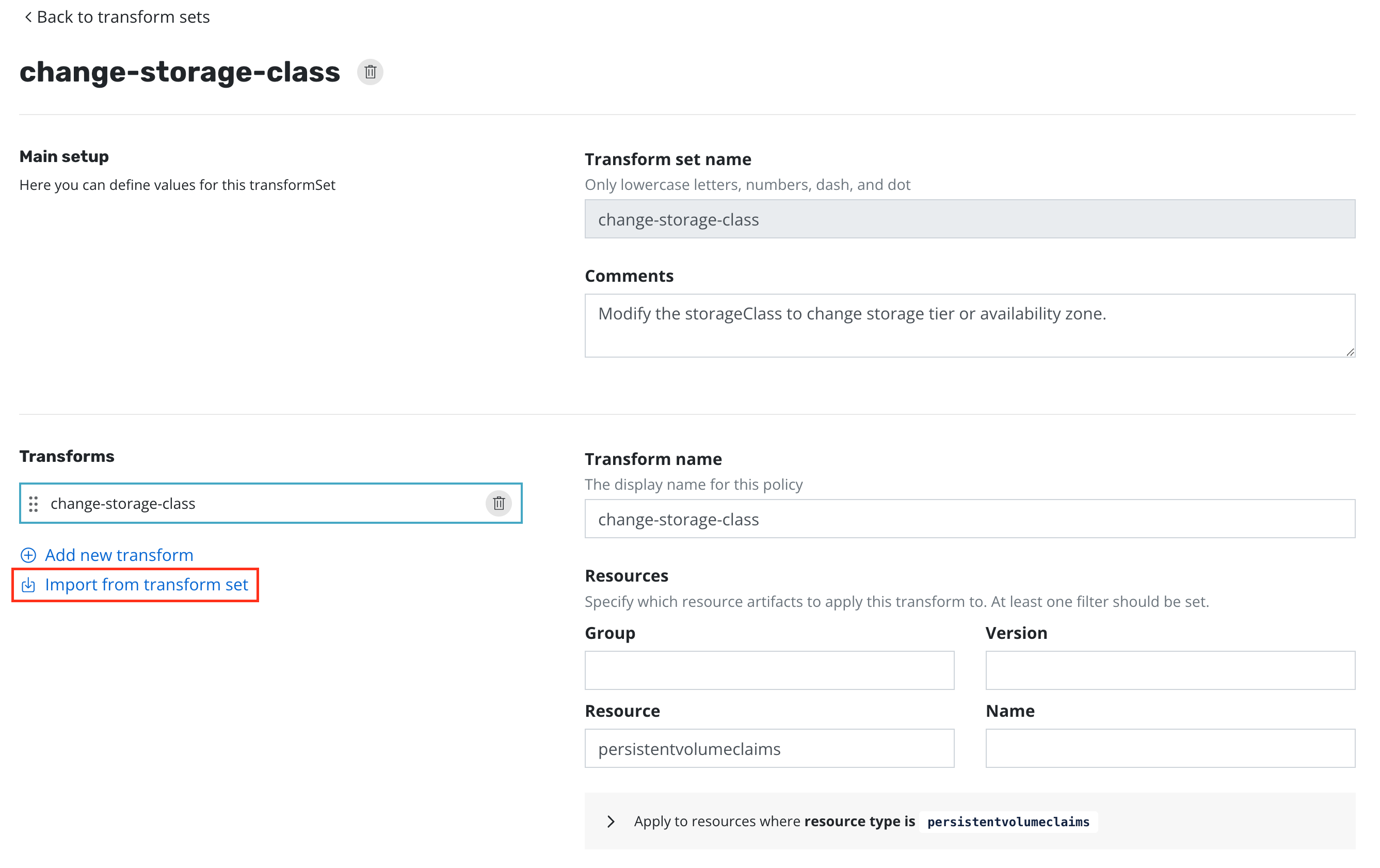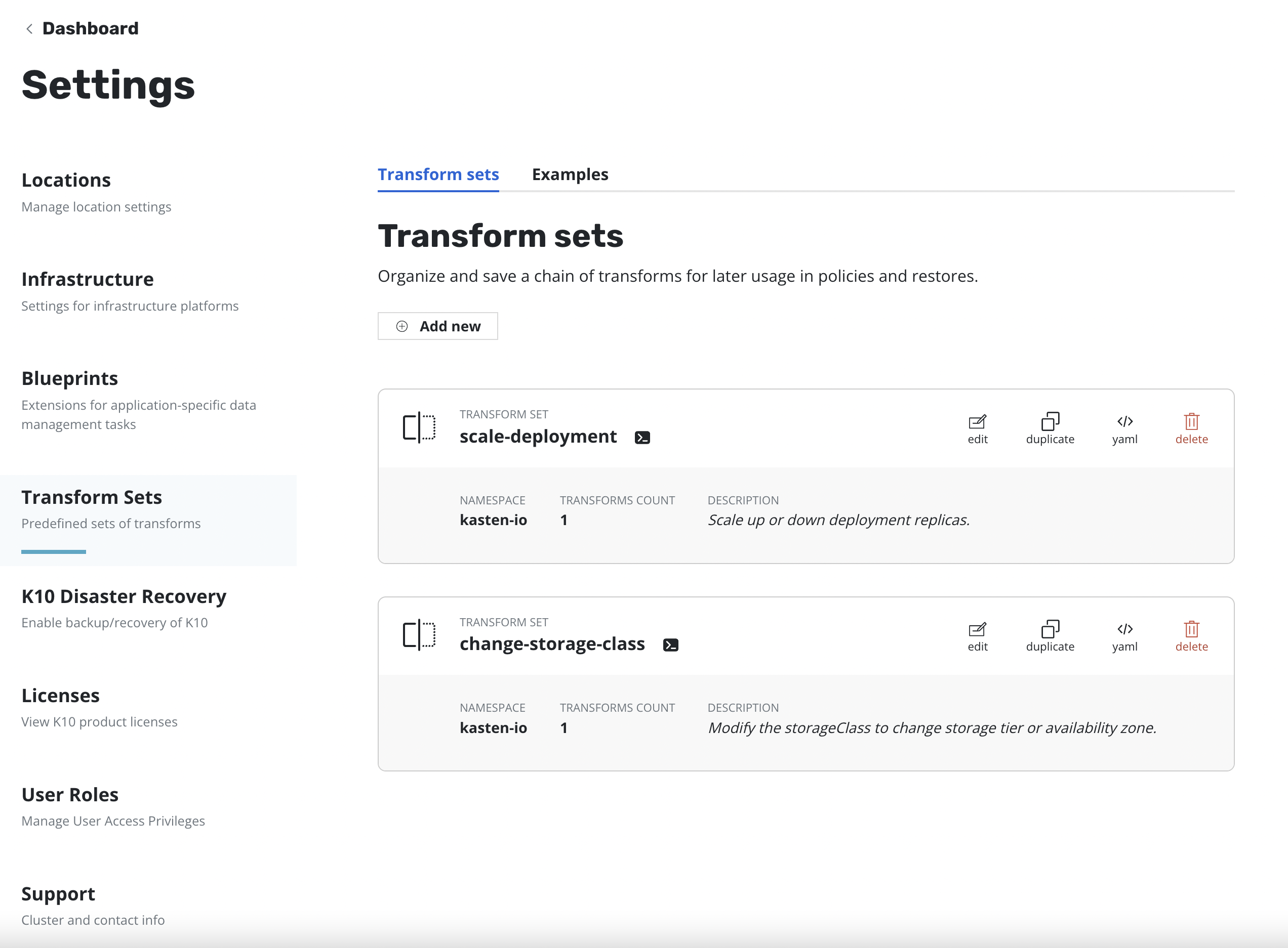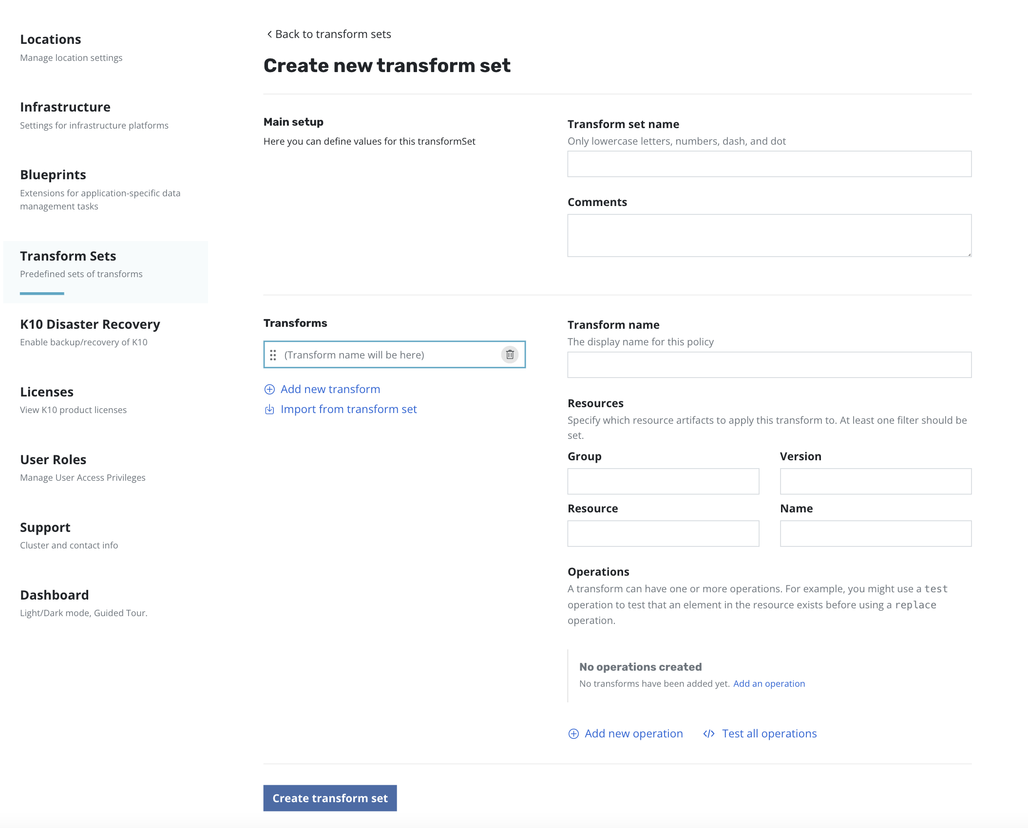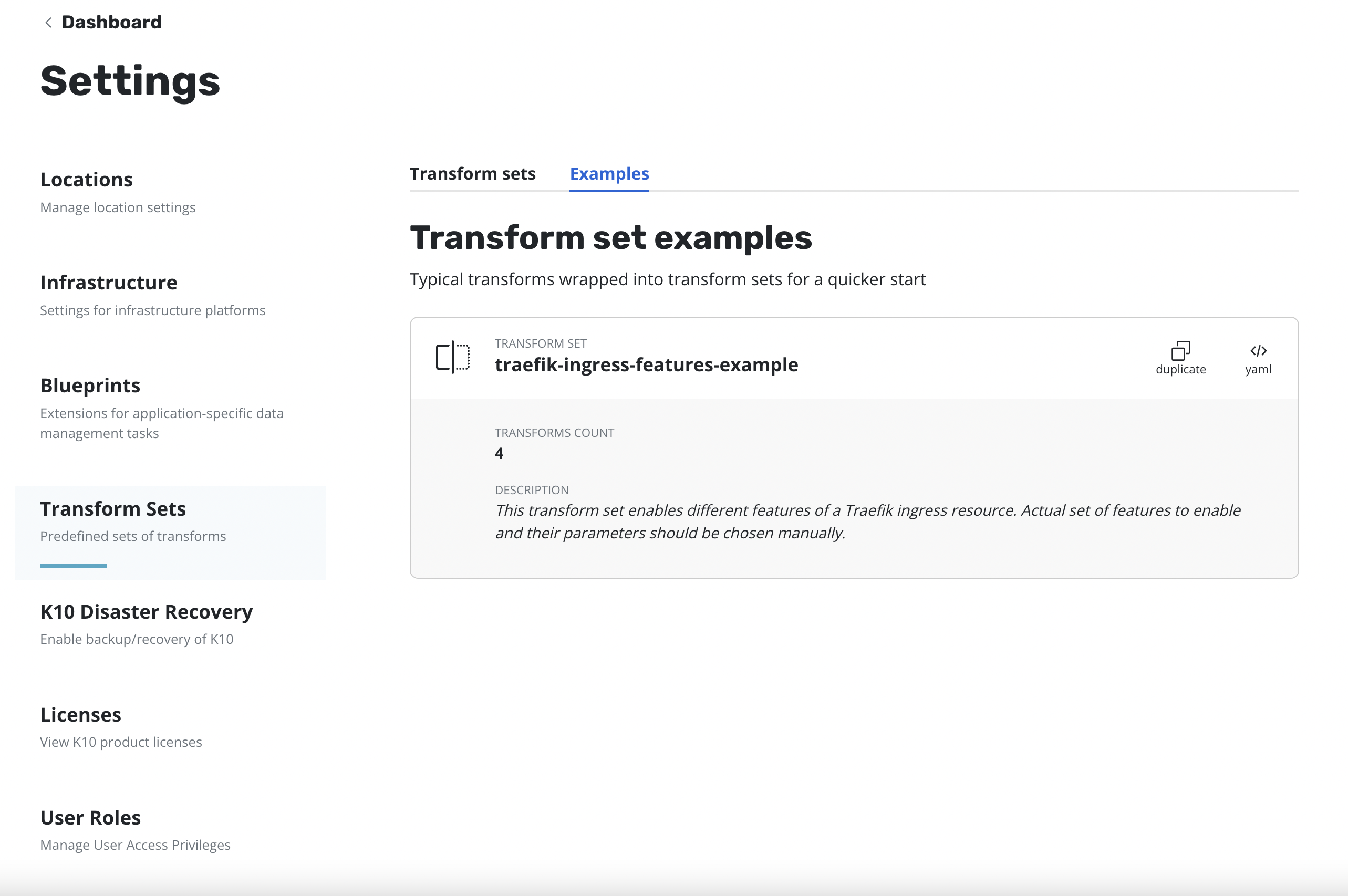 The "Transform Sets" tab on the Settings page can be used to manage sets of transformations for later usage in policies and restores.