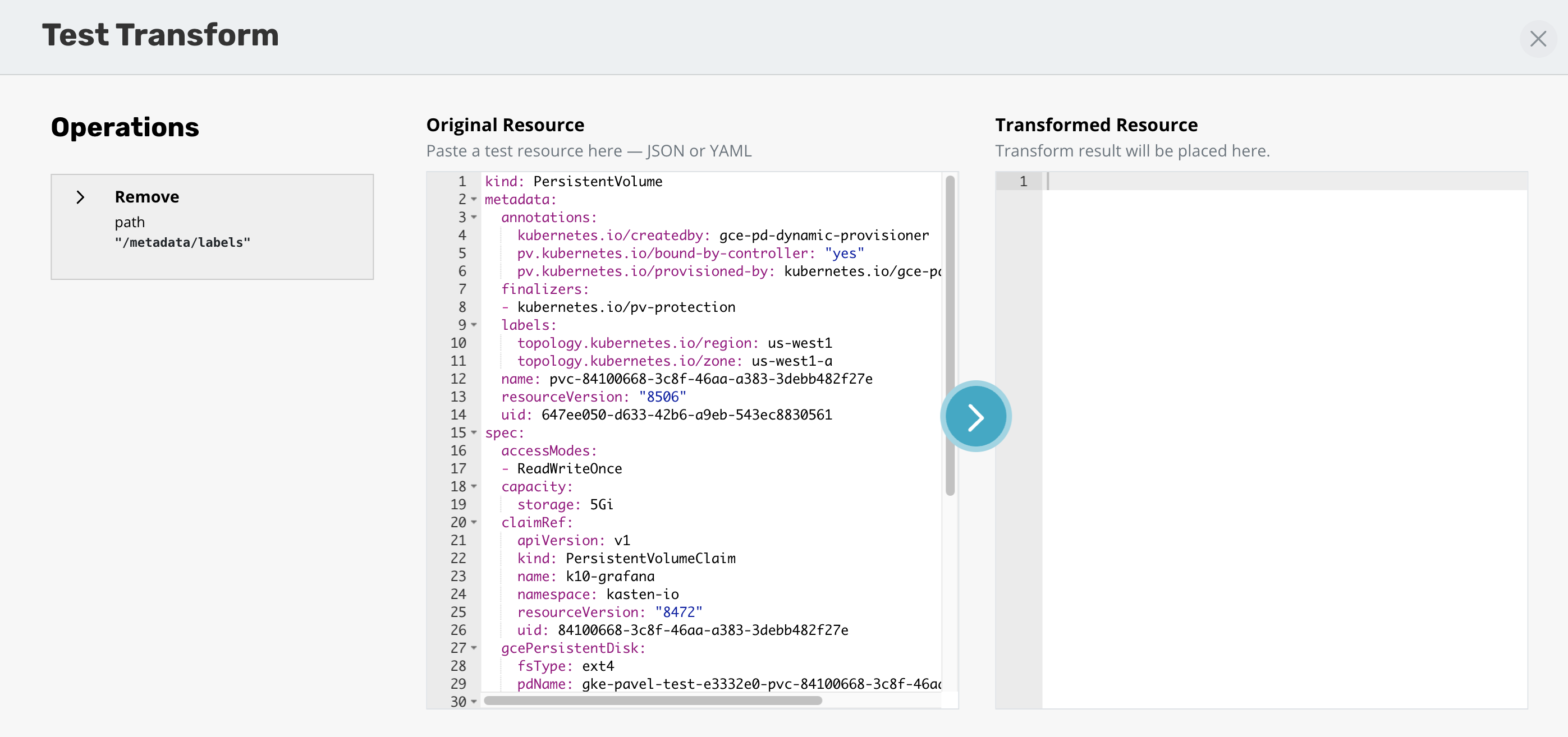 3. Click the arrow button in between Original and Transformed windows. In the current example, the operation will remove the whole metadata branch of the object. Thus it can be assumed the operation will work as intended.