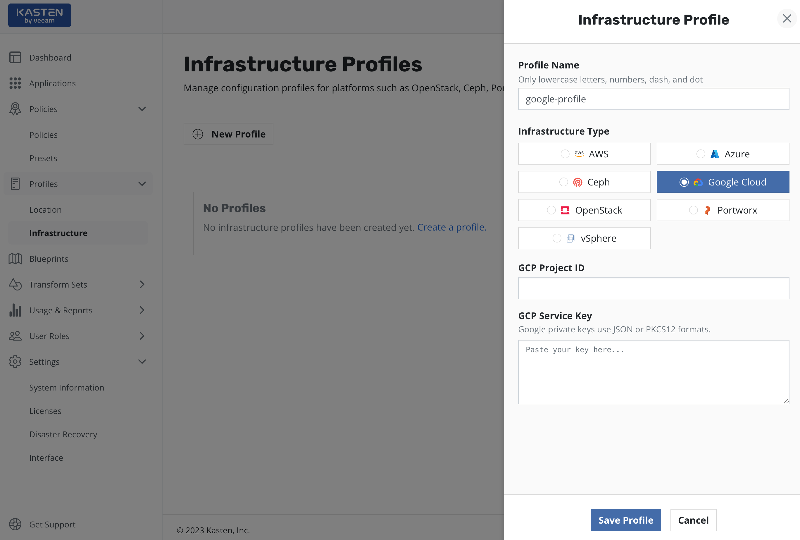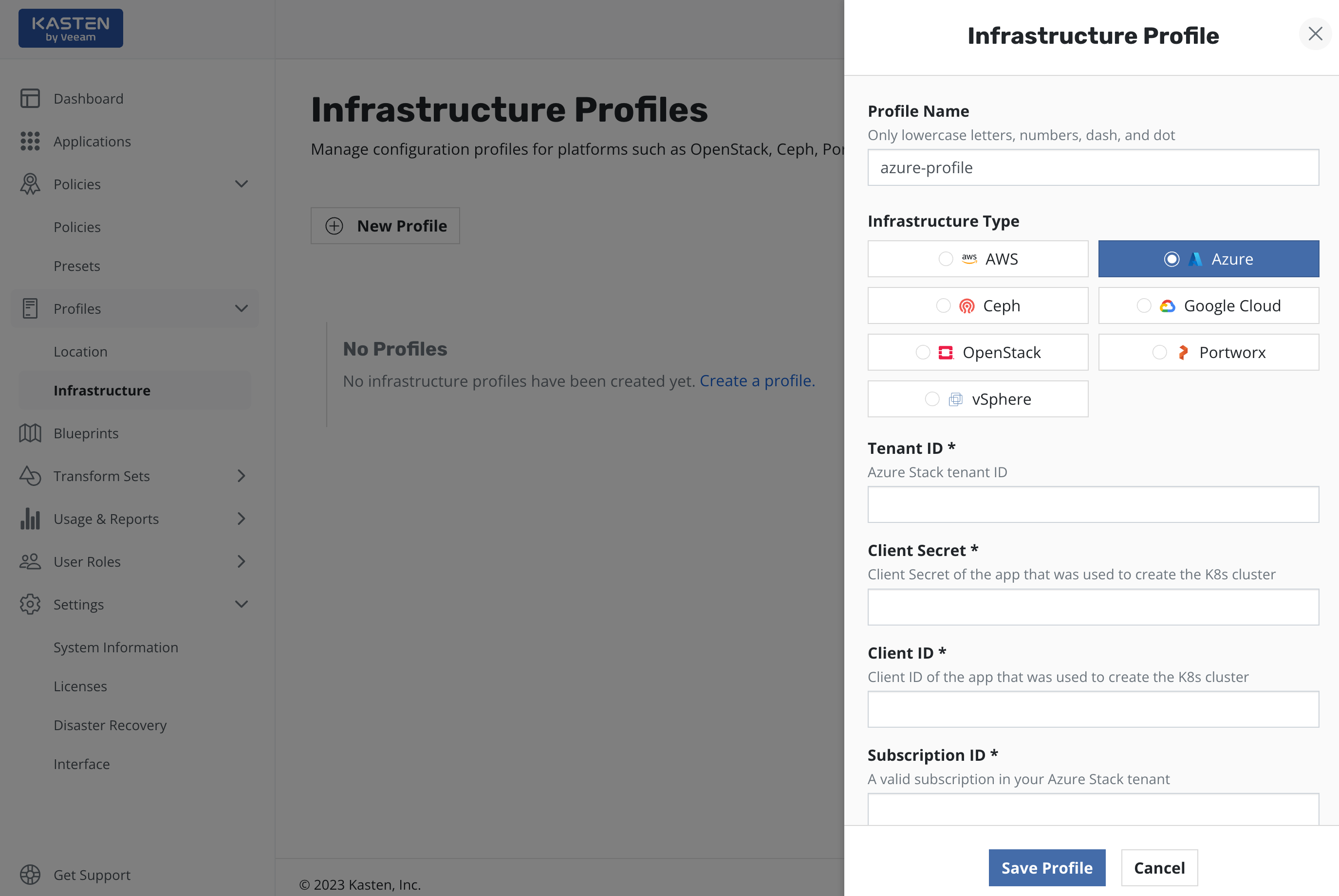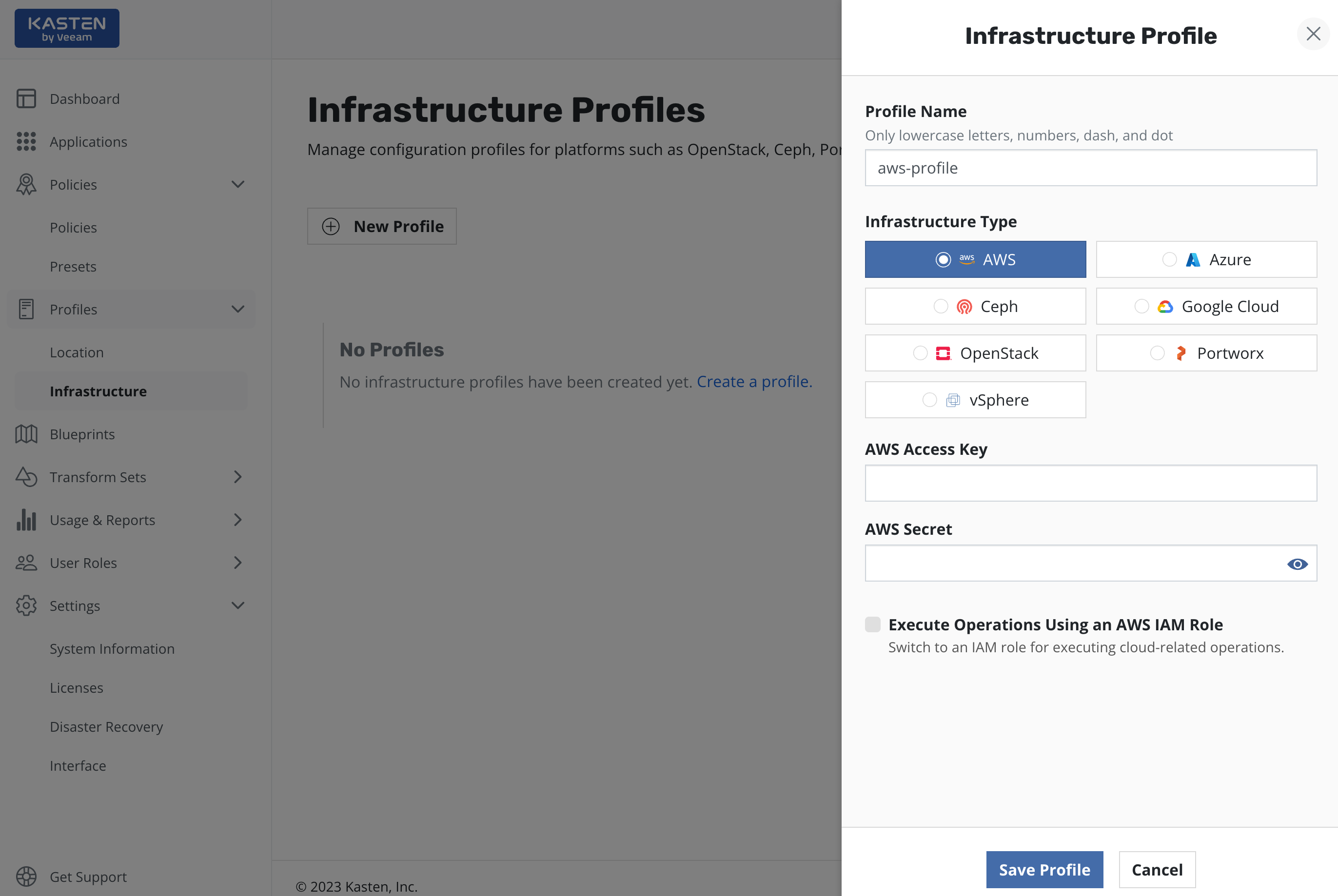 Infrastructure page of the Profiles menu in the navigation sidebar