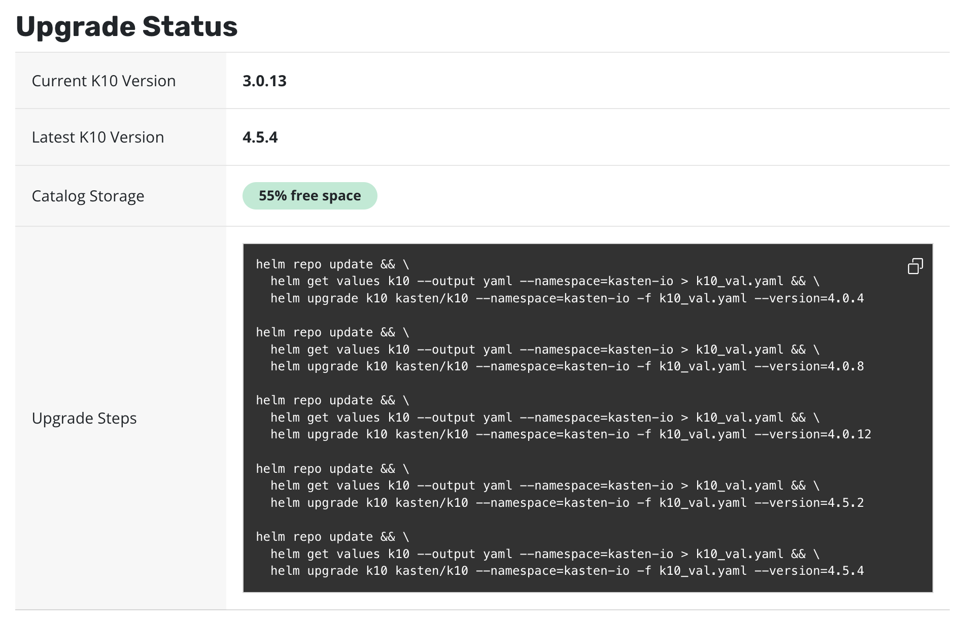 Currently, upgrades are only supported across a maximum of four versions (e.g., 2.0.10 -> 2.0.14). If your K10 version is further behind the latest, a step upgrade process is recommended where you can use the --version flag with helm upgrade to control the version jumps. At least 50% free space is required in catalog storage also.