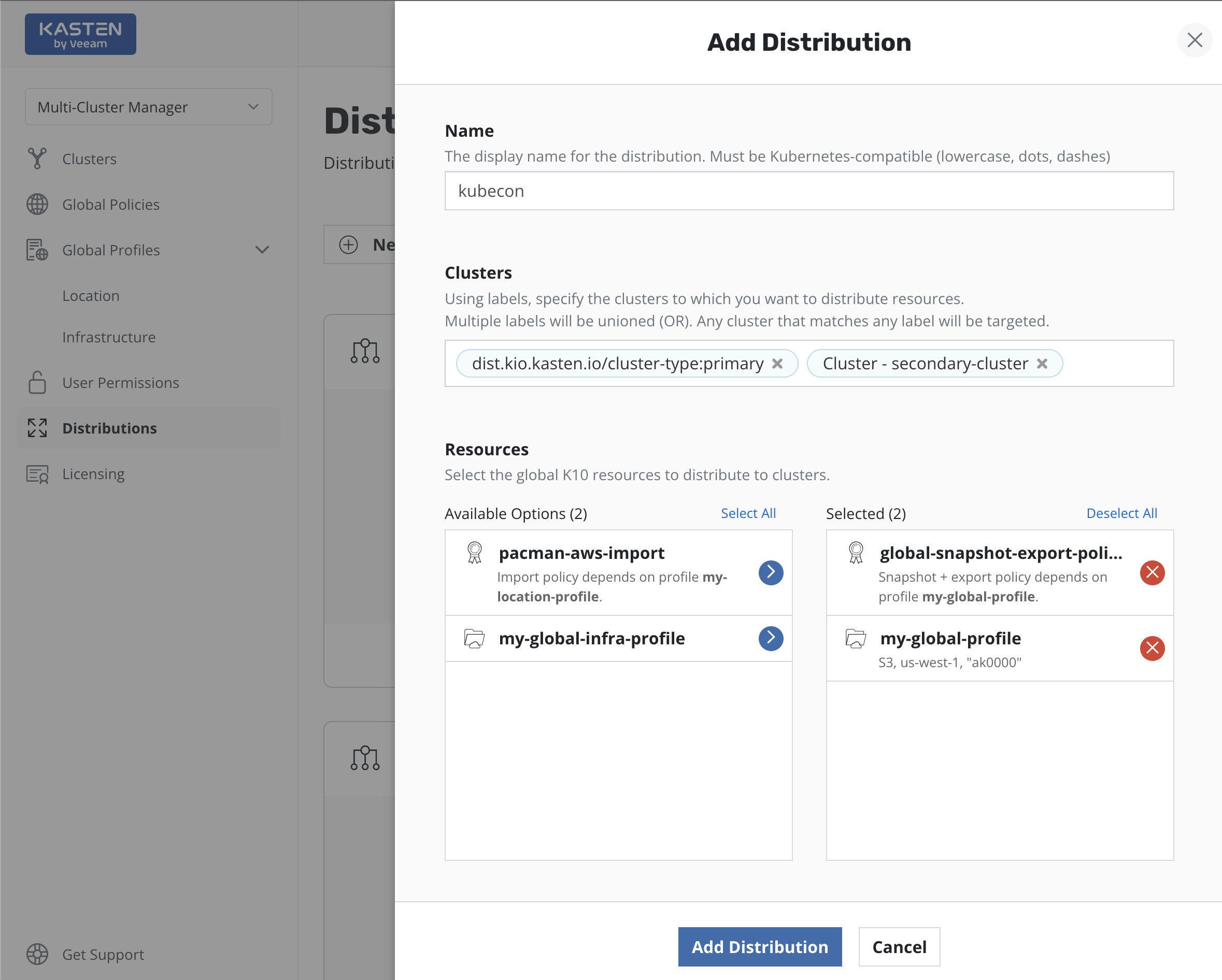Distributions provide a way to describe the relationship between globally defined resources and the clusters to which they should be distributed. This affords a tremendous amount of flexibility, allowing the correct policies to be applied to the correct clusters.