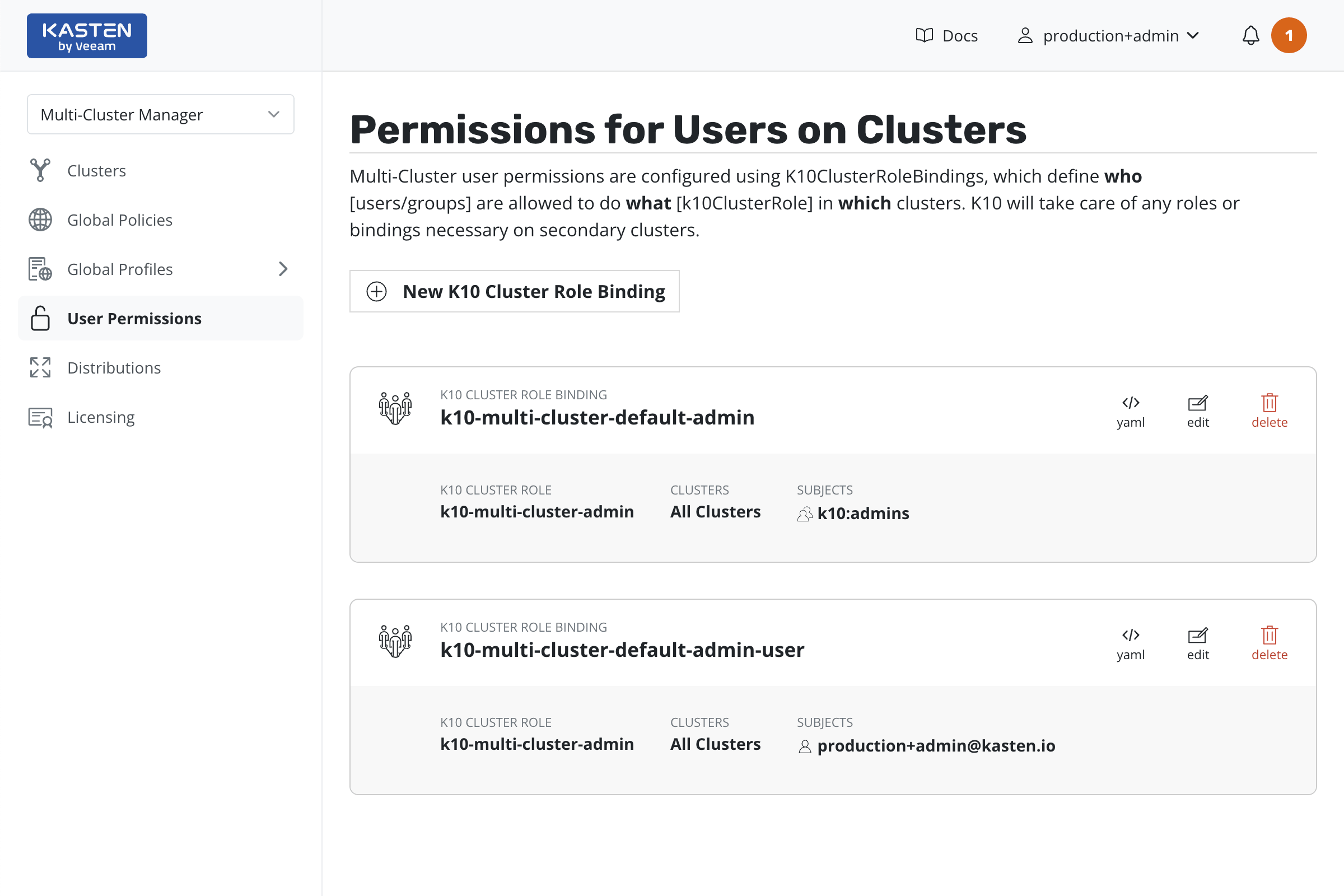 For users to get access to K10 Multi-Cluster Manager, K10 Multi-Cluster access control can be configured.