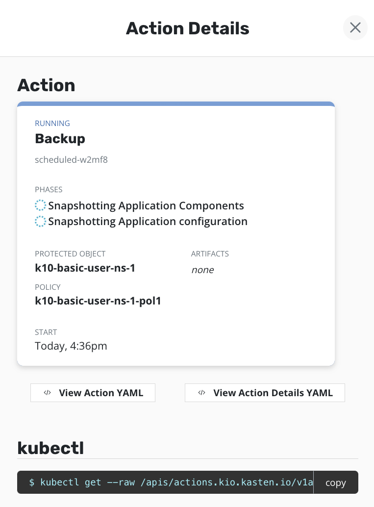 Users who are not administrators can create K10 policies in an application's namespace for protecting only that specific application. The image below shows the dashboard as viewed by a non-admin user who has access to policies.