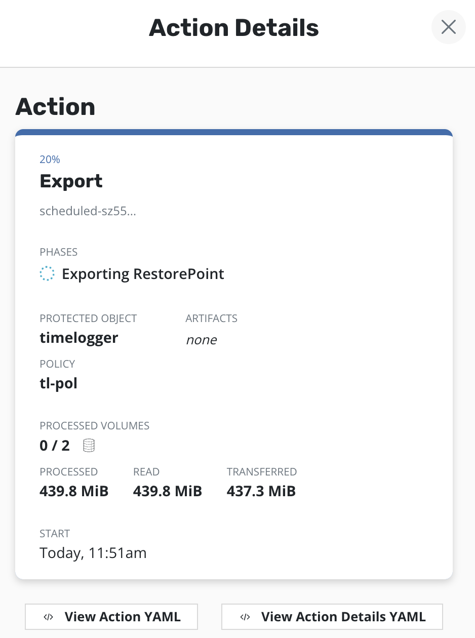 It is possible to monitor the number of processed volumes and the data processed while the export is running via the Action Details view.