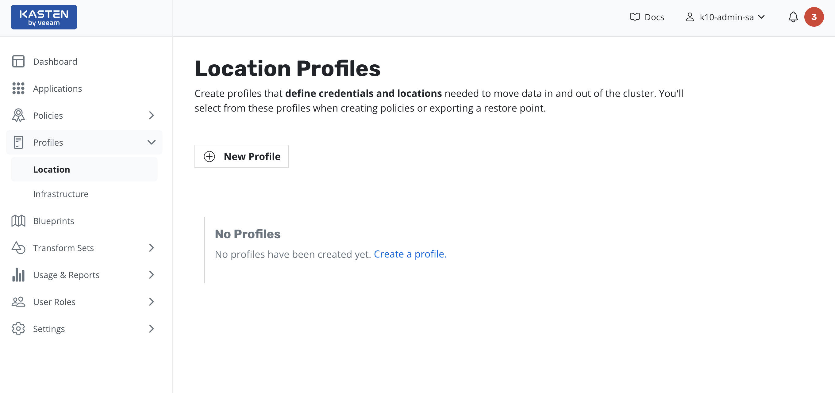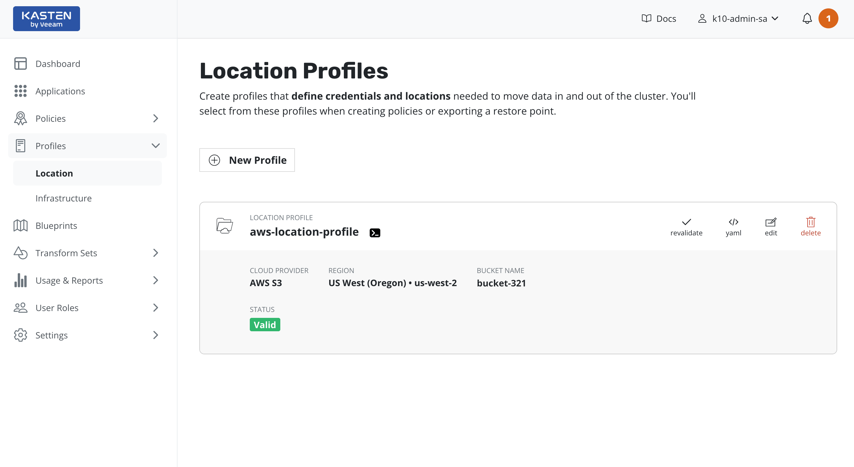 Once a bucket has been prepared with each of these requirements met, a profile can be created from the K10 dashboard to point to it.